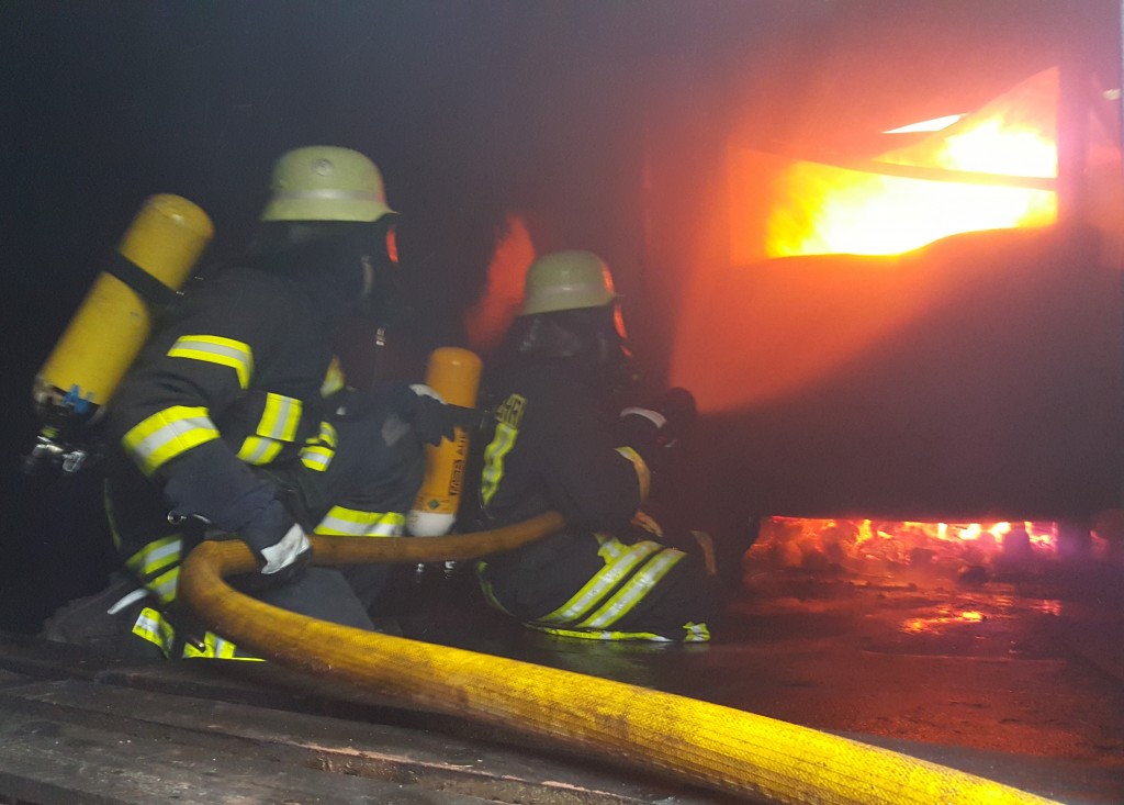 Nun gibt es nur noch eine Türe die zwischen den Trupps und dem Feuer steht. Die Tür wird abgetastet und unter den Kommando „Tür heiß“ geöffnet. Die Hitze schlägt sofort in den Raum. So tief wie möglich kriechen die Kameraden in den Container wo sie das Feuer sehen können. Die Hitze ist fast unerträglich, die Ohren Brennen.