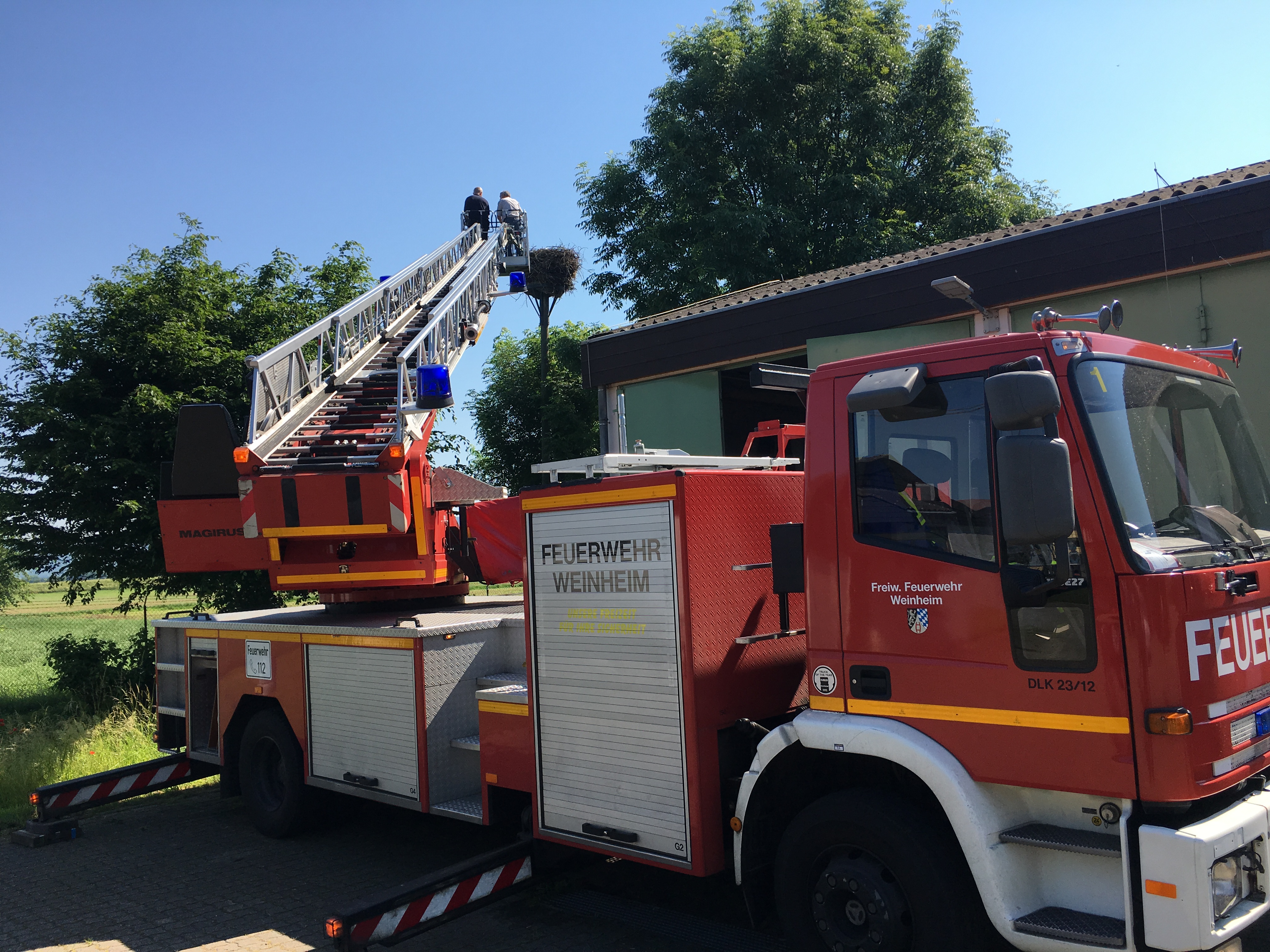 Stein ist es so ein Leichtes, den Jungvögeln die schwarzen Ringe jeweils am rechten oberen Ständer, so die korrekte Bezeichnung der Storchenbeine, anzulegen. Naturschutzwart Dietmar Matt bat dafür die Freiwillige Feuerwehr um Mithilfe. Stadtkommandant Ralf Mittelbach und Karsten Fath unterstützen die Aktion in Weinheim mit einer Leiter zum Horst, ebenso wie Kommandant Joachim Steilen mit zwei seiner Kollegen in Hemsbach für die dort drei Jungstörche. In wenigen Wochen schon beginnen sie ihre Reise ins südliche Winterquartier in Spanien, Marokko oder den Savannen südlich der Sahara. Sie bleiben dort etwa drei Jahre bis zu ihrer Geschlechtsreife und kehren dann ins hiesige Brutgebiet zurück.