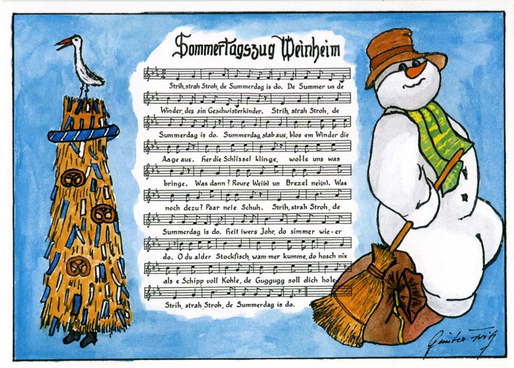 Der Kindergarten „Waid“ bringt ein Pony mit, viele Gruppen haben einen Bollerwagen dabei, die Siedler aus der Weststadt haben wieder mal eine Fahrradgruppe angemeldet – einige Jahre musste man auf dieses bunte Bild verzichten. Sicher lustig: Auch die „Woinemer Spanier“ wollen den Winter nach eigenen Angaben „mit fröhlichem Gesang“ vertreiben. Sie befinden sich in guter mediterraner Gesellschaft, denn acuh die Griechen der „Philia“ mit Musik und Tanz, sowie der neu gegründete deutsch-italienische Freundeskreis „Centro Italiano“ begrüßt mit „Bella Italia“ den Frühling. Stolz präsentieren die Italiener einen 500er-Fiat des Baujahres 1969. Nach einem baustellenbedingten Umweg im letzten Jahr zieht der Sommertagszug jetzt wieder die gewohnten Kreise. Die Aufstellung ist wie immer in der Grundelbachstraße bis zur Peterskirche. Um 14 Uhr geht’s los, durch die Untere und die Mittlere Hauptstraße, die Bahnhofstraße, eine Schleife durch die Luisenstraße und an der Weinheim Galerie hinein in die Fußgängerzone bis zum Marktplatz. Dort wird der Schneemann zu den Klängen der Stadtkapelle in Flammen aufgehen.