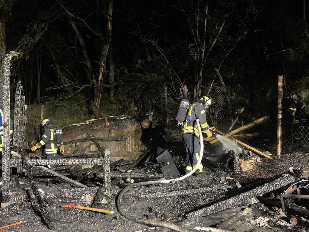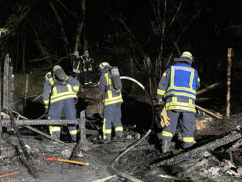 Eine Flut von Notrufen aus der Nord- und Weststadt gingen in der Nacht zum Ostersonntag bei der Leitstelle Rhein Neckar kurz vor vier Uhr ein. Ein rasch größer werdendes Feuer und meterhohe Flammen beunruhigte viele Weinheimer, die den Brand bemerkten wie Sie auf der Facebook Seite der Weinheimer Feuerwehr kommentierten. Die Freiwillige Feuerwehr Weinheim Abteilung Stadt rückte zum Vogensenweg aus und fand dort eine Gartenhütte vor, die in voller Ausdehnung brannte. Wegen der aktuell trockenen Vegetation weitete sich das Feuer auf den angrenzenden Wald aus. Mit vier Trupps unter Atemschutz, 2 C-Rohren und mit dem Waldbrandset (D-Rohr) wurde die mittlerweile fast abgebrannte Hütte, sowie der angrenzende Wald abgelöscht. Mit Einreishaken und Dunggabeln wurde das Brandgut auseinandergezogen, um an Glutnester zu gelangen, um diese ebenfalls zu löschen. Aufgrund des unwegsamen Geländes wurde eine Wasserförderung über lange Wegstrecke aufgebaut. Somit war gewährleistet genügend Löschwasser den Berg hoch in den Wald zu bekommen. Die Abteilung Sulzbach unterstützte die Löscharbeiten und der Abrollbehälter Löschmittel mit 8000 Liter Wasser wurde als Löschwasserpuffer eingesetzt. Nach rund 2 Stunden konnten die Einsatzkräfte wieder einrücken. Die Polizei Weinheim hat die Brandursachenermittlung aufgenommen. (Siehe auch Presseinformation der Pressestelle der Polizei).