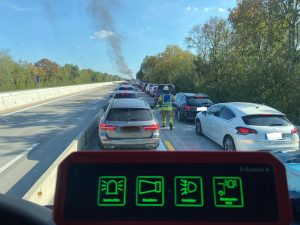 Weinheim. Auf der Autobahn 5 kam es kurz vor der Anschlussstelle Hirschberg in Fahrtrichtung Karlsruhe zu einem Pkw-Brand. Aufgrund der Baustelle wurde neben der Weinheimer Feuerwehr auch die Freiwillige Feuerwehr Ladenburg alarmiert. Die Anfahrt gestaltet sich schwierig, da die Rettungsgasse durch die Fahrbahnverengung schwierig war. Feuerwehr und Rettungsdienst kamen daher nicht durch. Dies leider auch, weil etliche Autofahrer, sobald ein Rettungsfahrzeug durch war, sich nach dem Vorbeifahren wieder auf die linke Fahrspur einreihten und somit die Fahrbahn für nachrückende Kräfte versperrten. Somit blieb der Feuerwehr und dem Rettungsdienst nichts anders übrig, als auszusteigen und alle Autofahrer einzuweisen. Manche wurden gebeten zurück und nach vorne zufahren, damit durch die Lücken die Autos auf der Überholspur auf die rechte Spur fahren konnten. Parallel dazu sperrte die Autobahnpolizei die Fahrspur Richtung Süden, so dass die Feuerwehr Ladenburg regulär über die Autobahn, aber auch entgegengesetzt zur Einsatzstelle fahren konnten.