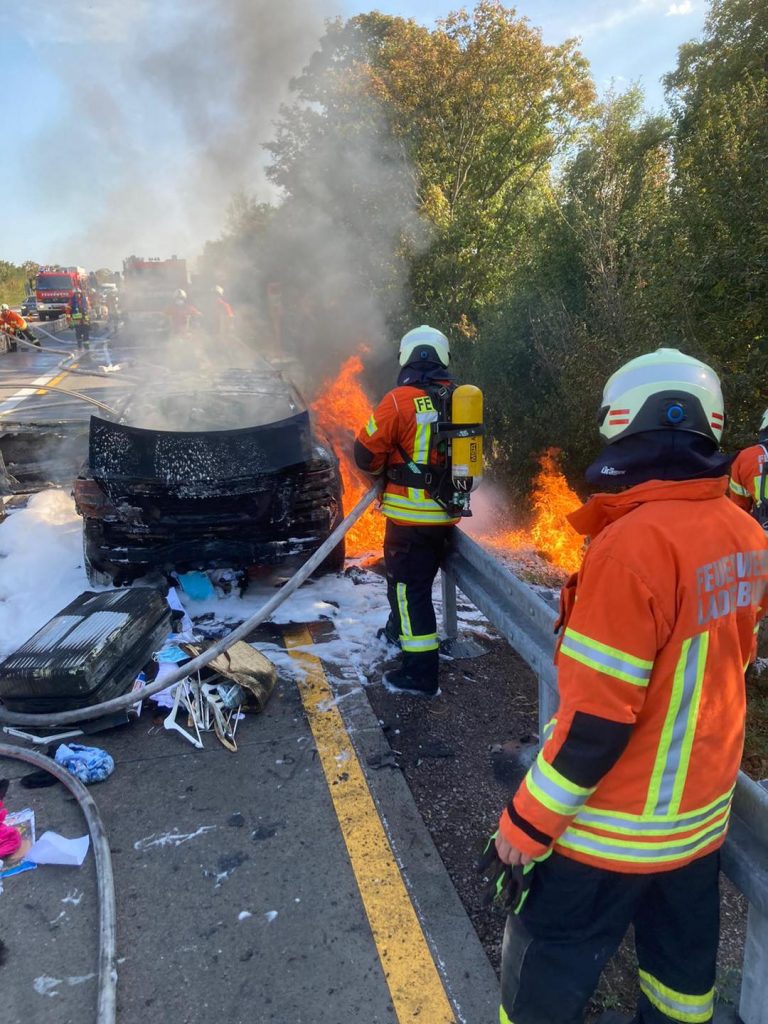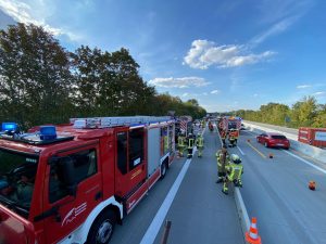 Das Fahrzeug konnte stand bei Ankunft der Feuerwehren im Vollbrand. Eine Mutter mit Kind, die mit dem Fahrzeug unterwegs waren, wurden vom Rettungsdienst betreut und zur Vorsorge in ein Krankenhaus eingeliefert. Die Einsatzkräfte löschten den Brand und unterstützten die Polizei bei den Sicherungsmaßnahmen. Während der Lösch- und Bergungsarbeiten war die Einsatzstelle Richtung Süden für über 2 Stunden voll gesperrt. In Richtung Norden konnte eine Fahrspur offen gelassen werden.