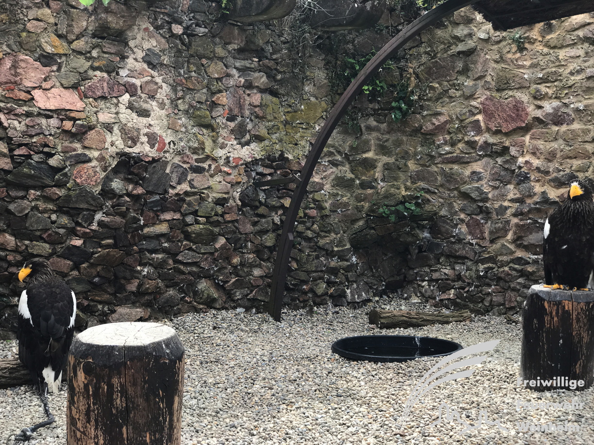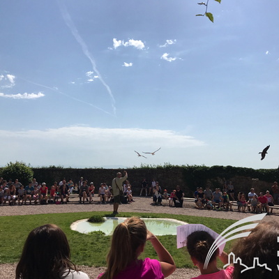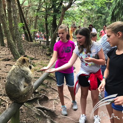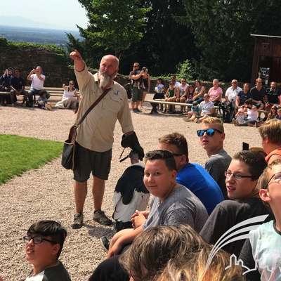 Auch am nächsten Tag wurde den Jugendlichen wieder viel geboten. Am Vormittag bot die Greifvogelwarte „Adlerburg“ in Kintzheim ein eindrucksvolles und ergreifendes Schauspiel: Eine Flugschau mit den größten Greifvögeln der Welt in der Burgruine von Kintzheim. Eine einzigartige Gelegenheit für die Jugendlichen den Tieren so nah zu kommen, wie es in der freien Natur nicht möglich wäre. Vor dieser mittelalterlichen Kulisse flogen die schönsten Greifvögel der Welt nur wenige Zentimeter an Jugendlichen und Betreuer vorbei. Auf dem Programm stand ein packendes Schauspiel mit den Kunstflügen der Schwarzmilane, die Überflüge der Bussarde und Geier und die Begegnung mit dem Andenkondor. Nach der spannenden Flugshow ging es zum nächsten Tierischen Tagespunkt. Der Affenberg (Montagne de Singes) ist eine besondere Attraktion im Elsass. Dort leben rund 200 Berberaffen, diese sitzen in kleinen Gruppen zusammen und können sich auf dem weitläufigen Waldgelände des Affenberges, frei bewegen.