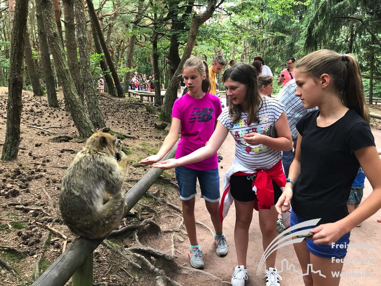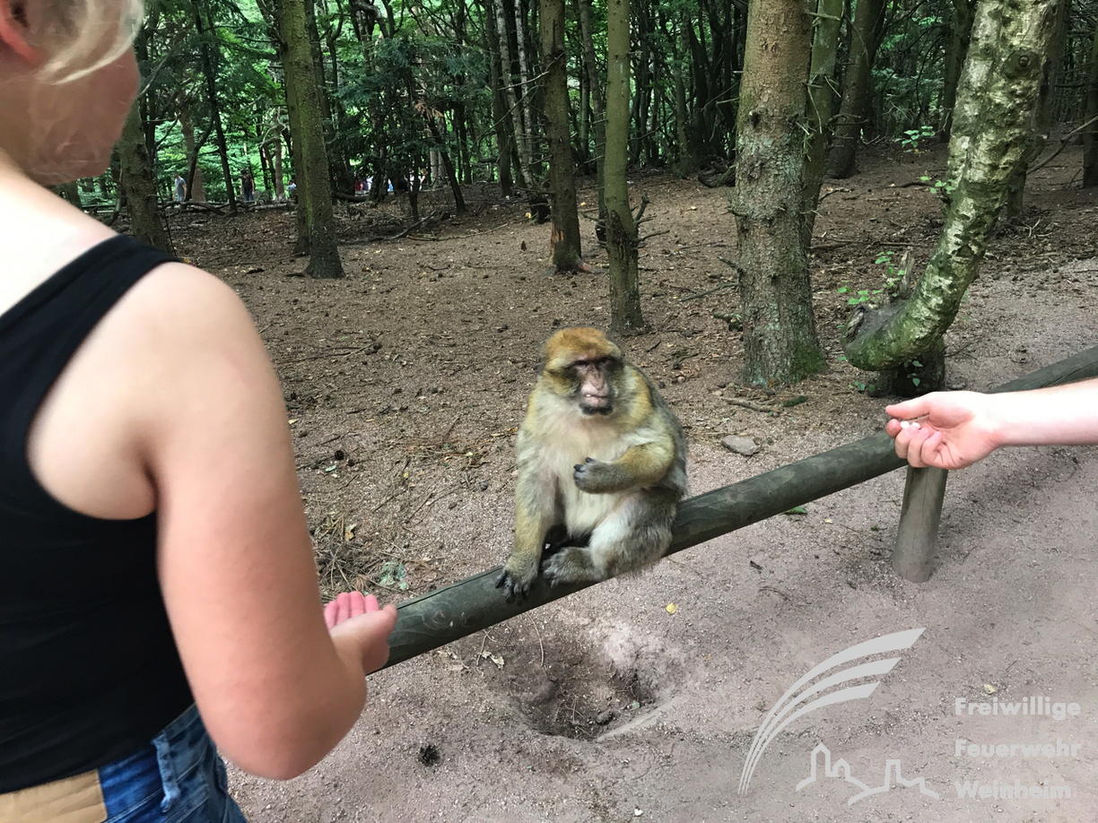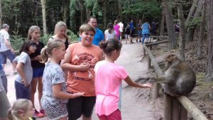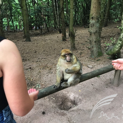 Die mutigeren Affen wagen sich an die Menschen heran. Sie wissen offensichtlich, dass jeder Besucher beim Betreten des Parkgeländes etwas Popcorn in die Hand gedrückt bekommt. Sehr interessant war auch die Fütterung der Berberaffen, wo die Jugendlichen auch über den ursprünglichen Lebensraum und dass Gruppenverhalten viel lernten.