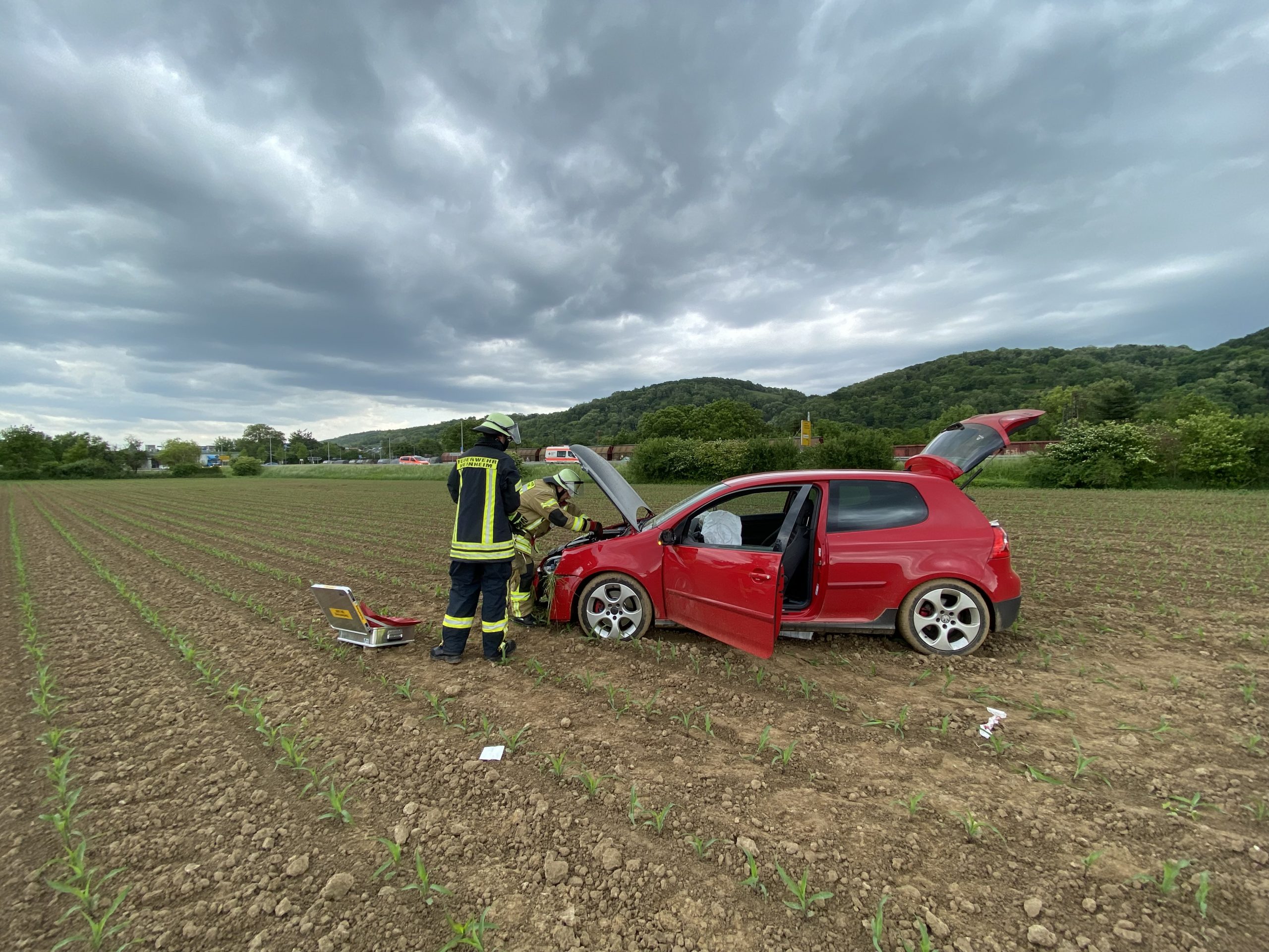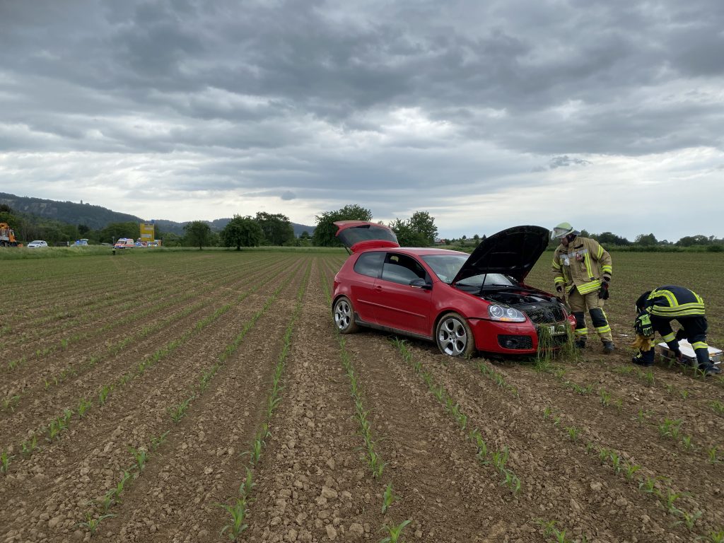 Weinheim. Mitten im Acker, parallel zur Kreisverbindungsstraße zwischen Weinheim und Hemsbach, landet ein PKW nach einem missglückten Überholmanöver im Feld. Daher rückten die Feuerwehrabteilungen Stadt und Sulzbach zur Einsatzstelle aus. Die zwei verletzten Fahrzeuginsassen wurden vom Rettungsdienst vor Ort medizinisch erstversorgt. Ein Patient musste wurde zur weiteren Behandlung ins Krankenhaus gebracht. Die Feuerwehr unterstützte die Absicherungsmaßnahmen der Polizei, stellte den Brandschutz sicher und kontrollierte das Unfallfahrzeug auf auslaufende Flüssigkeiten, um eine Bodenverunreinigung zu vermeiden. Die Einsatzkräfte der Feuerwehr halfen bei der Bergung des Fahrzeugs aus dem Acker und bekamen von einem Traktor Unterstützung. Nachdem auch die Batterie abgeklemmt war und das Fahrzeug wieder auf geteertem Boden gestanden war, konnte der Einsatz beendet werden.