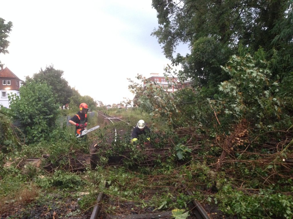 2014_08_11 _5_Die Bahnlinie der Deutschen Bahn in Richtung Fürth musste auch wegen einem Sturmschaden voll gesperrt werden, da ein umgestürzter Baum die Strecke, in Höhe Kappelenstraße, blockierte. Bedingt durch die Größe des Baumes wurde ein parkender PKW, auf dem nebenliegenden Parkplatz, stark beschädigt. Die Einsatzkräfte der Abteilung Stadt beseitigten mit Hilfe von Kettensägen den Baum und konnten dem Notfallmanager der Deutschen Bahn die geräumte Strecke übergeben.