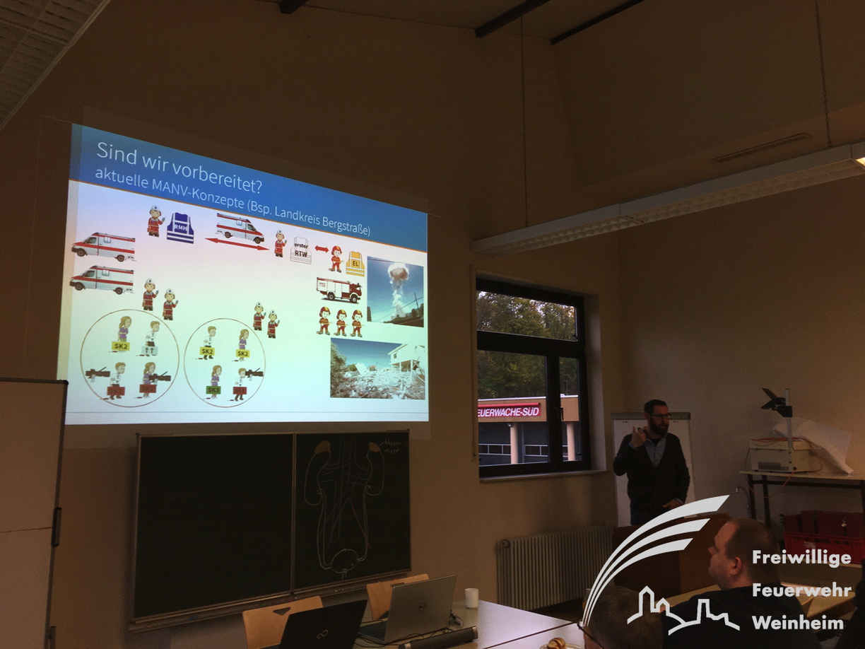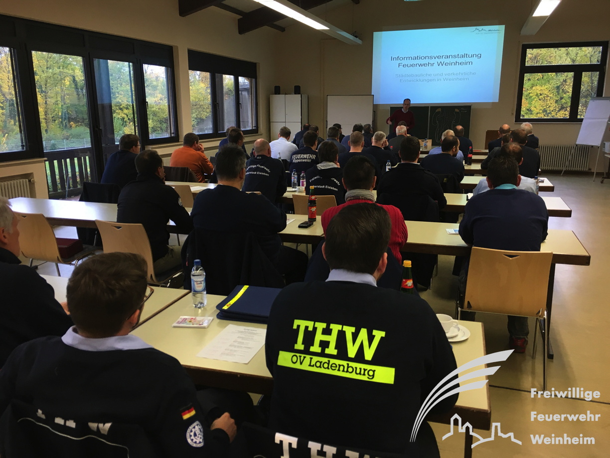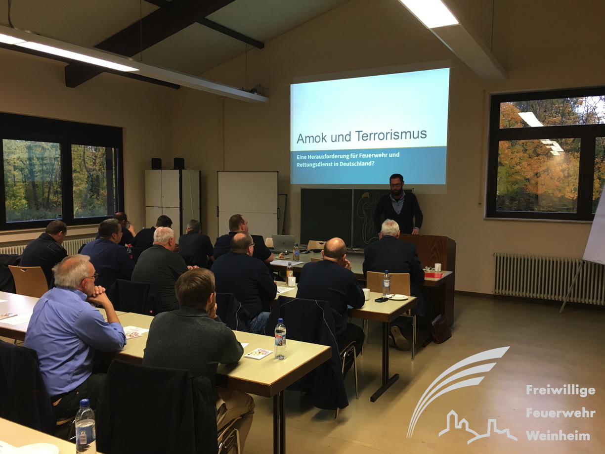 Bereits zum 25sten mal veranstaltete die Freiwillige Feuerwehr Weinheim ein Seminar für die eigenen Führungskräfte um sich weiterzubilden. Eine gute und wichtige Tradition ist es auch die benachbarten Feuerwehren und Hilfsorganisationen dazu einzuladen. Da die Weinheimer Feuerwehr ein wichtiger Partner in der Region ist und daher auch oft über die Stadtgrenzen hinaus zur Unterstützung gerufen wird, dient dieses Seminar auch dazu sich persönlich und die Arbeitsweisen der jeweiligen Organisation kennenzulernen. Dieses Jahr nahmen neben den Weinheimer Gruppen- und Zugführern auch Führungskräfte der Feuerwehren aus Hemsbach, Viernheim, Dossenheim, sowie der Partnerstadt Feuerwehr Lutherstadt Eisleben, der Werkfeuerwehren Freudenberg und Naturin, dem Technischen Hilfswerk Ladenburg, und der Johanniter Unfallhilfe Viernheim teil. Feuerwehrkommandant Reinhold Albrecht begrüßte die Teilnehmer von Feuerwehren und Hilfsorganisation sowie seinen Nachfolger Sven Lillig, der zum 1. Januar bei der Weinheimer Feuerwehr seinen Dienst beginnt.  Wie bereits bei den letzten 25 Führungsseminaren, gab es wieder ein interessantes Seminarprogramm für die Führungskräfte.