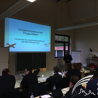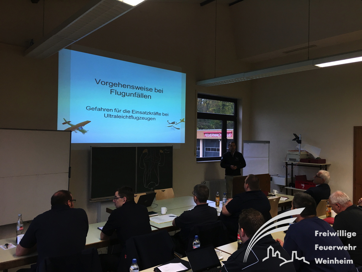 Im nächsten Vortrag ging es um „Vorgehensweise bei Flugunfällen – Gefahren für die Einsatzkräfte bei Ultraleichtflugzeugen“. Der Sicherheitsbeauftragter Segelflugplatz Weinheim Timo Bardelli, referierte über die verschiedenen Luftfahrzeugklassen und besonders über die Ultraleichtflugzeuge, die immer mehr im deutschen Luftraum unterwegs sind. Diese verfügen in den meisten Fällen über Gesamtrettungssysteme wie Fallschirme, die bei Gefahr von den Piloten ausgelöst werden können oder Airbags die bei einem Flugzeugcrash automatisch auslösen. Er erklärte wie diese Systeme aufgebaut sind und wie diese auslösen. Er erklärte, wie die Einsatzkräfte bei Unfällen mit den Luftsportgeräten umgehen müssen. Außerdem ging er darauf ein, welche Gefahren es nach einem Unfall an den Fluggeräten gibt. Diese Hinweise waren für die Führungskräfte besonders wichtig, um richtige Entscheidungen zu treffen, damit die Einsatzkräfte bei der Bergung von Verletzten geschützt werden können.