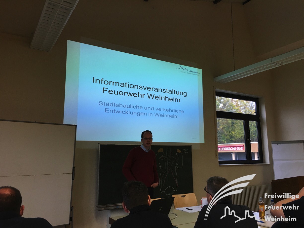 „Weinheim im Wachstum – Auswirkungen für die Feuerwehr durch Einwohnerzahlen, Verkehrswege, Gewerbe- und Wohngebiete“ war der nächste Fachvortrag auf der Agenda von Sven-Patrick Marx, dem Leiter des Amt für Stadtentwicklung der Stadt Weinheim. Wie schaut die Stadtentwicklung in den nächsten Jahren in Weinheim aus. Welche Herausforderungen muss sich die Feuerwehr stellen, um bei den Baumaßnahmen  und städtebaulichen Veränderungen immer noch die Sicherheit der Bürger gewährleisten zu können. Ein wichtiger Aspekt waren auch die Veränderungen der Verkehrswege in der Kernstadt, wie zum Beispiel die Erneuerung der Mannheimer Straße mit der Umlegung der Straßenbahnschienen und der Verlegung der aktuellen Haltestelle Luisenstraße.