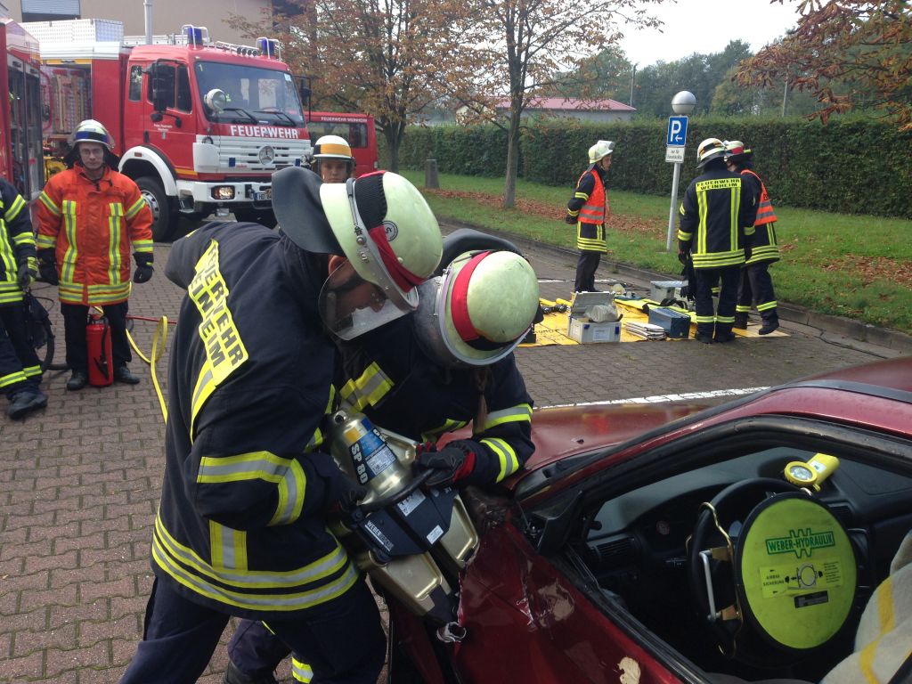 Themenschwerpunkte der Ausbildung waren. Gefährliche Stoffe und Güter, Gefahren an der Einsatzstelle, 2014_10_29_01Unfallverhütungsvorschriften, Technische Hilfeleistung und Brandbekämpfung, welche überwiegend in praktischen Übungen abgehalten wurde. Die Rechtsgrundlagen wurden von Clemens Englmeier an verschiedenen Beispielen unterrichtet. Die praktischen Übungen wurden mit ständig wechselnden Einsatzfahrzeugen der Feuerwehren des Unterkreises Weinheim durchgeführt, was den Vorteil bringt, dass alle Teilnehmer die Fahrzeuge der anderen Wehren kennen lernten und im Einsatzfall effektiver zusammenarbeiten können. Aber es gab auch sehenswerte Theorie, als Patrick Janowski seine „Experimentierkiste“ auspackte und den Teilnehmern in kleinen spektakulären Versuchen die Wirkungsweise, Vor- und Nachteile der verfügbaren Löschmittel vermittelte.