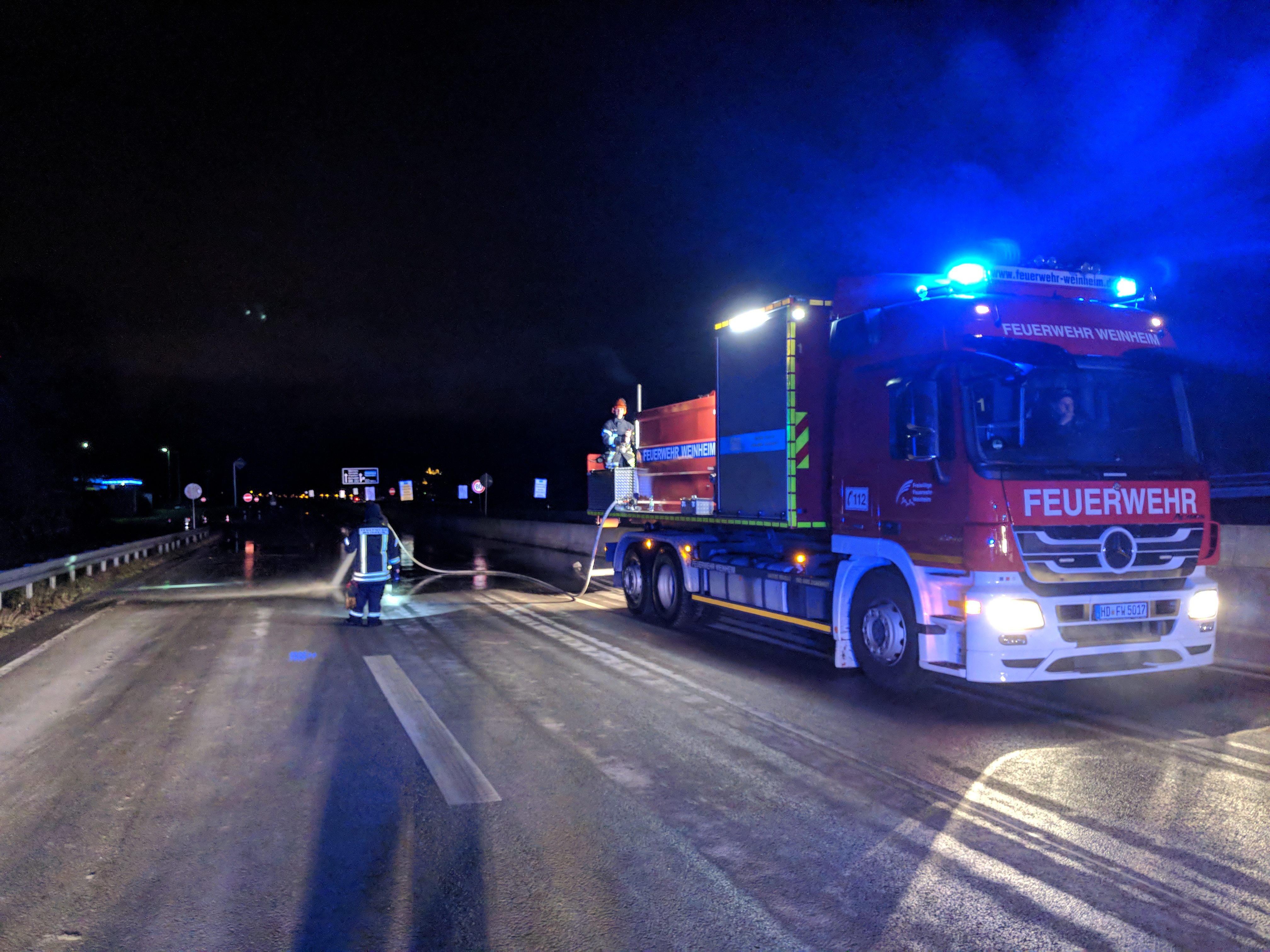 Weinheim / Viernheim. Die Feuerwehr Weinheim Abteilung Stadt wurde am gestrigen Abend um 20.39 Uhr mit dem Stichwort „Fahrbahnreinigung“ auf die Autobahn 659 in Richtung Viernheim alarmiert. Für gewöhnlich handelt es sich bei solchen Einsätzen um größere Mengen Betriebsstoffe, wie beispielsweise Öl ...