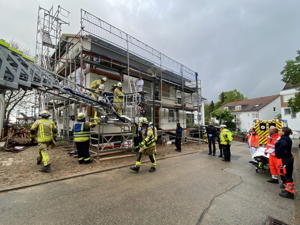 Weinheim. Am Mittwochmorgen wurde die Weinheimer Feuerwehr gemeinsam mit dem Rettungsdienst in die Olbrichtstraße zu einem Bauunfall alarmiert. Nach der ersten Meldung sollte dort ein Baugerüst zusammengebrochen sein. Nachdem die Einsatzkräfte von Polizei, Feuerwehr und Rettungsdienst vor Ort die Einsatzstelle suchten, ging eine erneute Meldung ein, dass sich die Einsatzstelle in der Merianstraße befindet. Daher wechselten die Rettungskräfte den Standort und konnten kurz danach den Unfallort ausfindig machen. Vor Ort stellte sich heraus, das ein Bauarbeiter durch ein Brett eines Baugerüst gebrochen war und auf die nächste Ebene stürzte. Dort wurde der verletzte Bauarbeiter bereits von Kollegen betreut. Während sich der Notarzt gemeinsam mit dem Rettungsdienst um die medizinische Erstversorgung kümmerte, sicherte die Feuerwehr das Baugerüst. Die Polizei sperrte während der Rettungsarbeiten die Merianstraße. Parallel dazu wurde eine Rettungsplattform vor dem Baugerüst aufgebaut und die Drehleiter in Stellung gebracht. Gemeinsam mit dem Rettungsdienst wurde der Verletzte mit einer Schaufeltrage vom Gerüst auf die Drehleiter gehoben und patientengerecht und schonend gerettet. Der Patient kam zur weiteren Behandlung ein Krankenhaus. Nach einer Stunde konnte der Einsatz beendet werden.