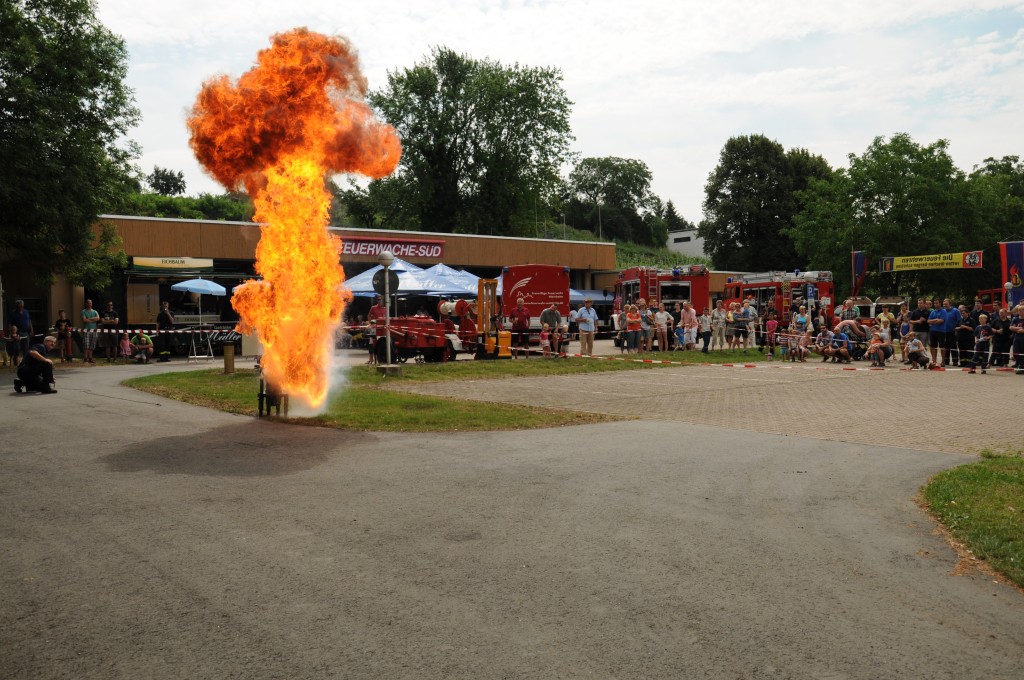 Auch in diesem Jahr haben sich die Kameraden der Wache Süd einiges für ihre Gäste einfallen lassen. Bei einer eindrucksvollen Vorführung machten die Einsatzkräfte auf die Gefahr einer Fettexplosion aufmerksam. Eine Fettexplosion entsteht, wenn Wasser auf brennendes Öl trifft. Da aus einem Liter Wasser 1600 Liter Wasserdampf entsteht, wird das brennende Fett hoch geschleudert und optimal mit dem Luftsauerstoff vermischt. Hierdurch entseht eine große Stichflamme, die bei der Vorführung besonders die kleinen Gäste beeindruckte.