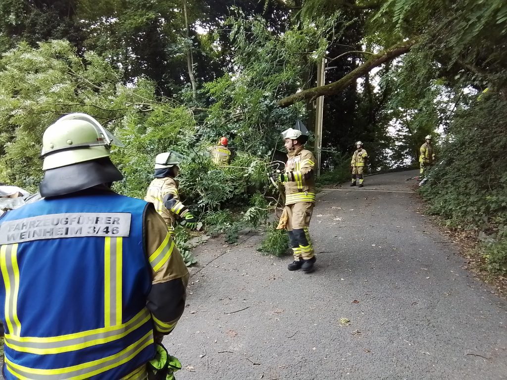 Am Sonntag wurde die Freiwillige Feuerwehr Weinheim Abteilung Lützelsachsen-Hohensachsen gegen 10 Uhr zu einem Windbruch in die Straße Am Bischof alarmiert. Vor Ort stellte sich heraus, dass ein etwa 8 Meter langer Baum mit einem Stammdurchmesser von rund 30 bis 40 Zentimetern aus dem aufgeweichten Boden eines Hanges herausgebrochen war. Er hatte sich auf ein Garagendach gelegt und spannte sich anschließend quer über die Straße. Die Feuerwehr sicherte die Einsatzstelle ab und begann unter Beachtung aller Sicherheitsvorgaben mit der Beseitigung des Baumes.