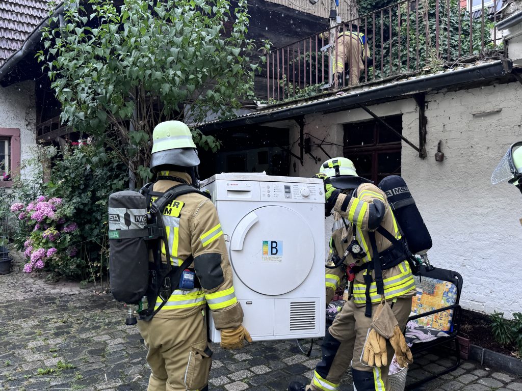 Kurz nach 10 Uhr wurde dann in der Alten Landstraße ein Zimmerbrand gemeldet. Daher rückten die Feuerwehrabteilungen Stadt und Lützelsachsen-Hohensachsen zur Einsatzstelle aus. Bei Ankunft der Feuerwehr konnte ein Anwohner bereits mit einem Gartenschlauch das Feuer durch ein Fenster löschen. Ein Trupp unter Atemschutz übernahm mit einem Rohr die Brandbekämpfung und führte Nachlöscharbeiten durch. Es stellte sich heraus, dass ein Wäschetrockner in Brand geraten war und die Flammen bereits auf die Elektroleitungen und Innenfassade des Raums übergegriffen hatten. Da die Flamme sich bis zur Decke gezüngelt ausgebreitet hatten, wurde auch die Decke und das Dach des Gebäudes auf Glutnester kontrolliert. Mit einem Hochdrucklüfter wurde der Brandrauch aus dem Gebäude gedrückt. Die Stadtwerke Weinheim kamen zur Unterstützung der Feuerwehr ebenfalls mit der Abteilung Strom vor Ort, da die Elektroleitungen durch den Brand beschädigt wurden. Um eine weitere Gefahr auszuschließen, wurde der betroffenen Bereich vom Stromnetz getrennt. Auch bei diesem Einsatz wurde niemand verletzt.