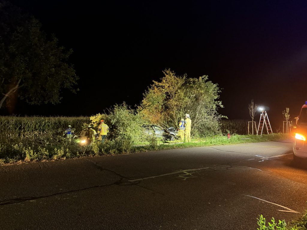 Ein schwerer Verkehrsunfall ereignete sich dann gegen 0:45 Uhr in der Nacht auf Sonntag. Über einen sogenannten automatischen E-Call Notruf wurde die Hilfskräfte über den Verkehrsunfall im Brunnweg alarmiert. Aus bisher ungeklärter Ursache war ein VW-T-Roc mit mehreren Personen von der Fahrbahn abgekommen und gegen einen Baum geprallt. Während sich der Rettungsdienst um zwei verletzte Personen kümmerte, unterstützte die Feuerwehr die Polizei bei der Absicherung der Einsatzstelle. Auch der Brandschutz wurde sichergestellt und die Unfallstelle großflächig ausgeleuchtet. Um einen besseren Zugang zu dem Fahrzeug zu bekommen, mussten mit der Kettensäge mehrere Bäume und Sträucher gefällt werden. Aufgrund weiterer Erkenntnisse an der Einsatzstelle, wurden weitere Unfallbeteiligte vermisst.