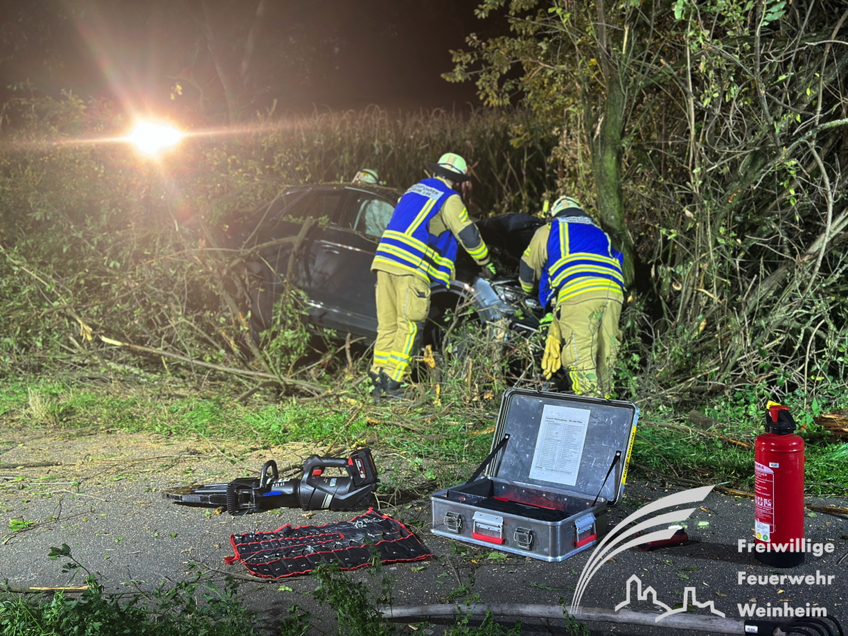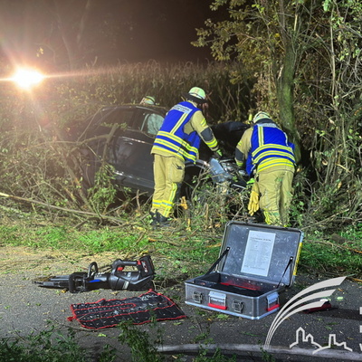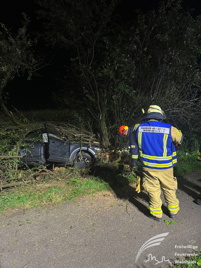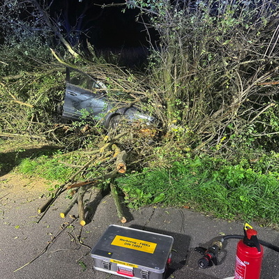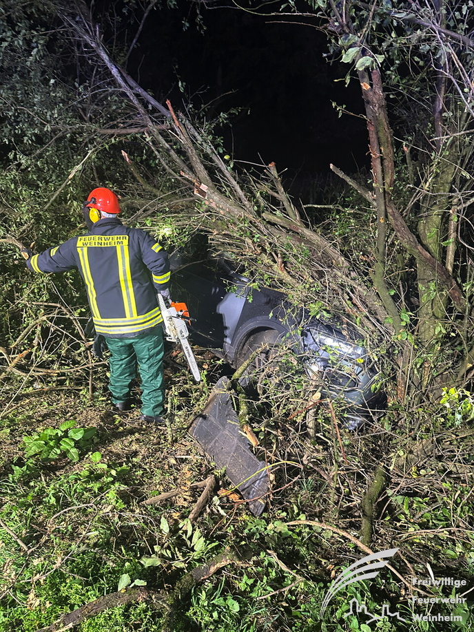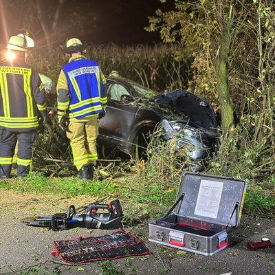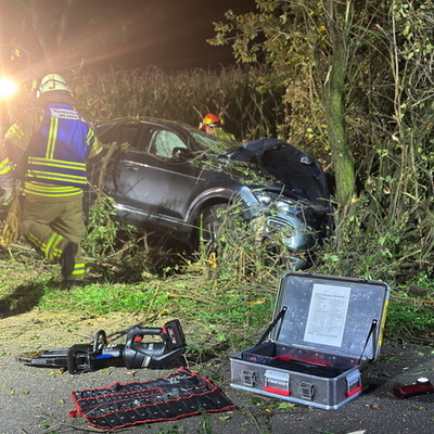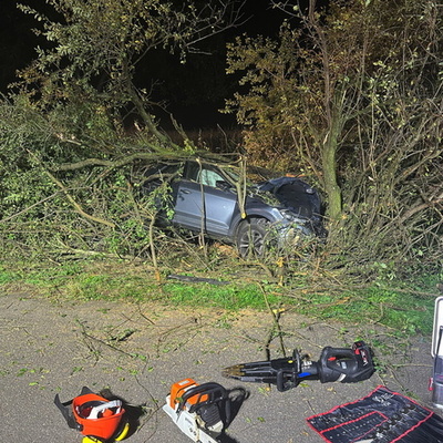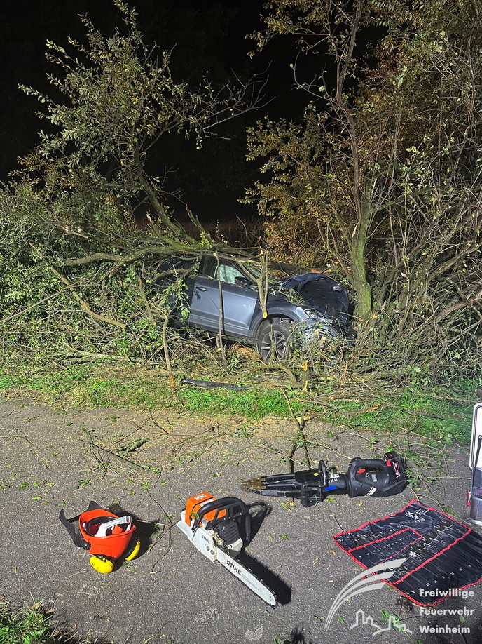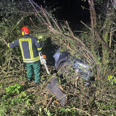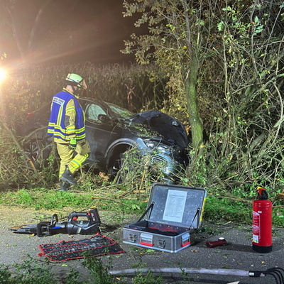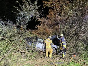 Ein schwerer Verkehrsunfall ereignete sich dann gegen 0:45 Uhr in der Nacht auf Sonntag. Über einen sogenannten automatischen E-Call Notruf wurde die Hilfskräfte über den Verkehrsunfall im Brunnweg alarmiert. Aus bisher ungeklärter Ursache war ein VW-T-Roc mit mehreren Personen von der Fahrbahn abgekommen und gegen einen Baum geprallt. Während sich der Rettungsdienst um zwei verletzte Personen kümmerte, unterstützte die Feuerwehr die Polizei bei der Absicherung der Einsatzstelle. Auch der Brandschutz wurde sichergestellt und die Unfallstelle großflächig ausgeleuchtet. Um einen besseren Zugang zu dem Fahrzeug zu bekommen, mussten mit der Kettensäge mehrere Bäume und Sträucher gefällt werden. Aufgrund weiterer Erkenntnisse an der Einsatzstelle, wurden weitere Unfallbeteiligte vermisst.