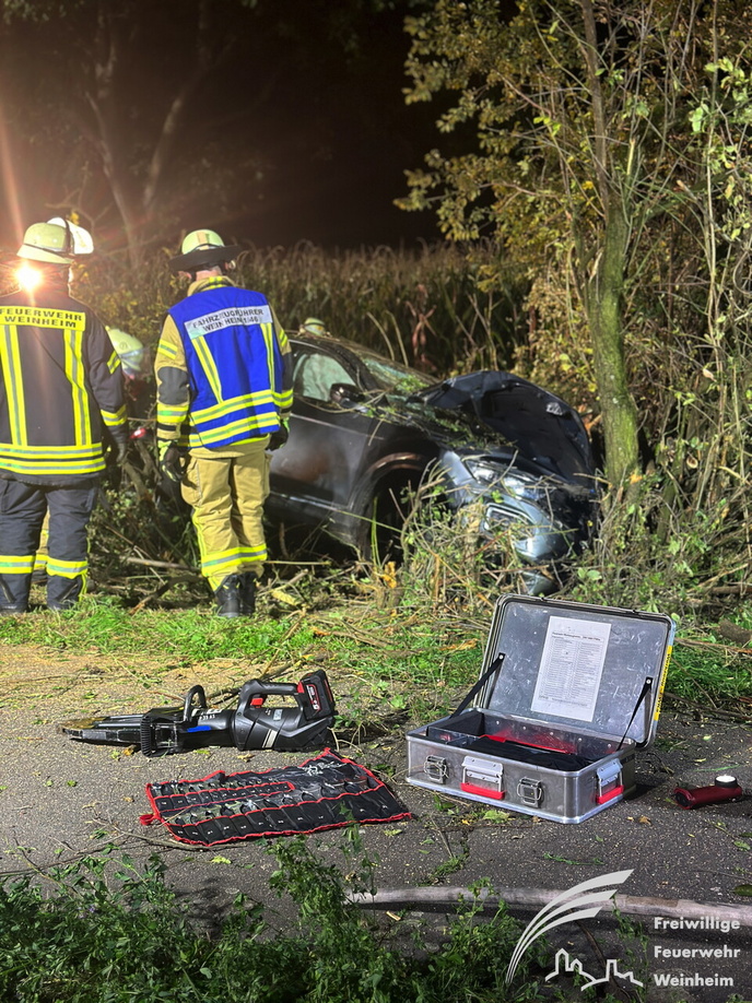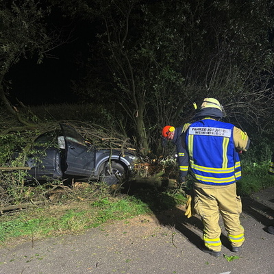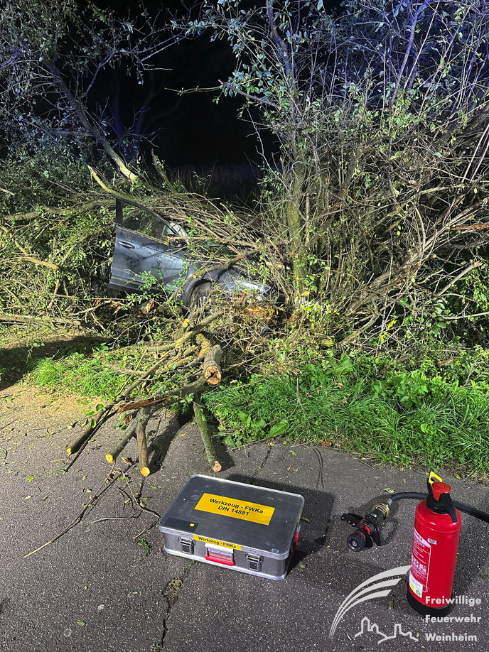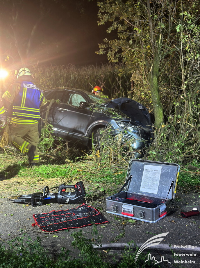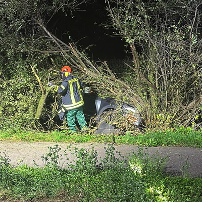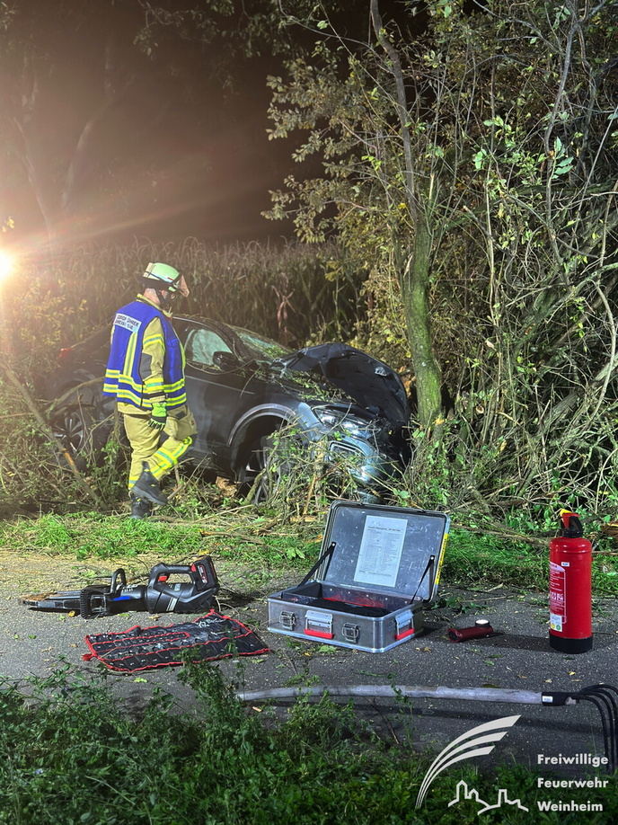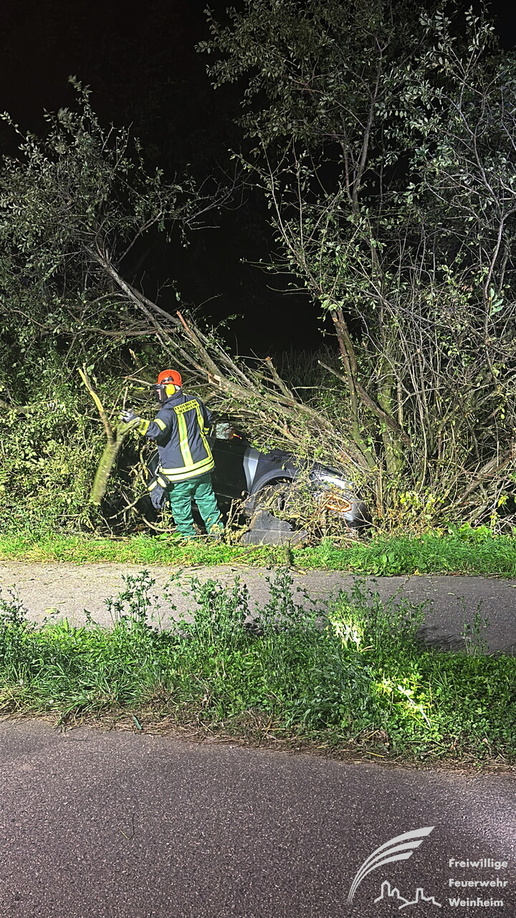 Ein schwerer Verkehrsunfall ereignete sich dann gegen 0:45 Uhr in der Nacht auf Sonntag. Über einen sogenannten automatischen E-Call Notruf wurde die Hilfskräfte über den Verkehrsunfall im Brunnweg alarmiert. Aus bisher ungeklärter Ursache war ein VW-T-Roc mit mehreren Personen von der Fahrbahn abgekommen und gegen einen Baum geprallt. Während sich der Rettungsdienst um zwei verletzte Personen kümmerte, unterstützte die Feuerwehr die Polizei bei der Absicherung der Einsatzstelle. Auch der Brandschutz wurde sichergestellt und die Unfallstelle großflächig ausgeleuchtet. Um einen besseren Zugang zu dem Fahrzeug zu bekommen, mussten mit der Kettensäge mehrere Bäume und Sträucher gefällt werden. Aufgrund weiterer Erkenntnisse an der Einsatzstelle, wurden weitere Unfallbeteiligte vermisst.