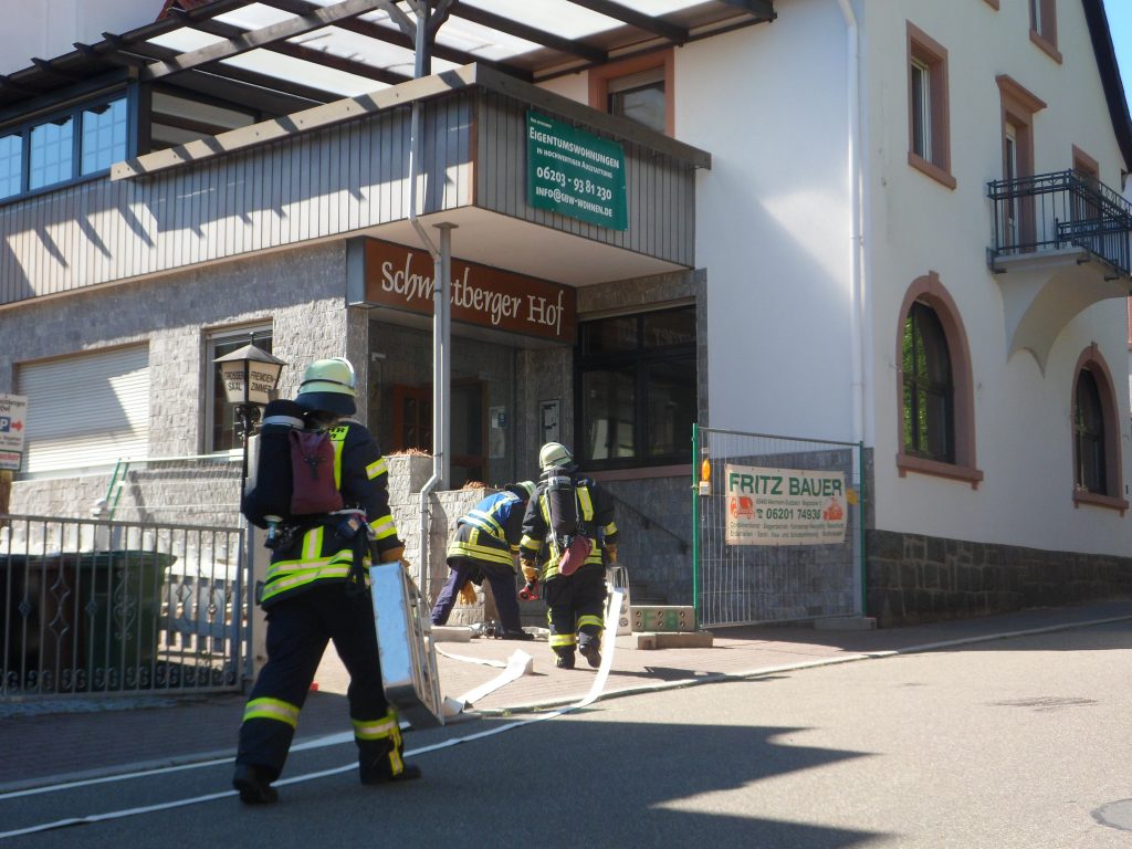 Löschfahrzeuge, Drehleiter die mit Martinshorn anfahren und Einsatzkräfte die Schläuche in der Weinheimer Straße ausrollen, sorgten für Aufmerksamkeit am Samstagmittag. Ziel war die ehemalige Speisegaststätte mit Hotelbetrieb Schmittberger Hof. Schnell aber routiniert bauten die Mannschaften der Fahrzeuge einen Löschangriff auf, während der Einsatzleiter zur weiteren Erkundung der Lage vorging. Es stellte sich heraus das aus dem zweiten Obergeschoss des Gebäudes Rauch aufstieg und ein Bauarbeiter vermisst gemeldet wurde. Zwei Angriffstrupps unter Atemschutz wurden sofort mit einer Leitung zur Menschenrettung in das Gebäude geschickt. Da das Feuer auf den Dachstuhl überzugreifen drohte, wird die die Drehleiter der Abteilung Stadt nachalarmiert. Nach kurzer Zeit konnte der vermisste Handwerker gerettet und einige Minuten später Feuer unter Kontrolle gemeldet werden. Zum Glück entstammte dieses Szenario nur einer Einsatzübung der Abteilung Lützelsachsen-Hohensachsen. Die Übung war jedoch so realistisch gestaltet, dass Sie für umstehende Passanten täuschend echt wirkte. Dieses Szenario wurde durch die GBW Bauträgergesellschaft mbH aus Heddesheim ermöglicht. Das Unternehmen hatte der Abteilung Lützelsachsen Hohensachsen das Abrissgebäude zur Verfügung gestellt. Da in solchen Gebäuden keine Schäden mehr verursacht werden sind diese für die Feuerwehren oft sehr wertvoll Objekte um absolut realistische Einsatzszenarien zu simulieren und zu üben. Die Übung war der Abschluss eines Übungsblocks mit dem Schwerpunkt Brandbekämpfung in dem die Abteilung Lützelsachsen-Hohensachsen ihre Einsatzbereitschaft eindrucksvoll unter Beweis stellen konnte. Auch die eingesetzte Drehleiter der Abteilung Stadt konnte nahtlos in die Übung eingebunden werden und beweist, wie auch die Einsätze in den letzten Tagen, dass die Abteilungen der Feuerwehr Weinheim Hand in Hand zusammenarbeiten. Dem stimmte auch Herr Kunkel von der GBW Bauträgergesellschaft mbH Heddesheim zu und bedankte sich bei Carsten Dübler und Markus Kratzer, die die Übung ausgearbeitet hatten, sowie dem gesamten Team für den interessanten Nachmittag am Schmittberger Hof.