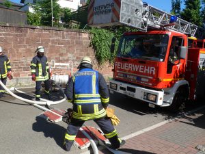 Löschfahrzeuge, Drehleiter die mit Martinshorn anfahren und Einsatzkräfte die Schläuche in der Weinheimer Straße ausrollen, sorgten für Aufmerksamkeit am Samstagmittag. Ziel war die ehemalige Speisegaststätte mit Hotelbetrieb Schmittberger Hof. Schnell aber routiniert bauten die Mannschaften der Fahrzeuge einen Löschangriff auf, während der Einsatzleiter zur weiteren Erkundung der Lage vorging. Es stellte sich heraus das aus dem zweiten Obergeschoss des Gebäudes Rauch aufstieg und ein Bauarbeiter vermisst gemeldet wurde. Zwei Angriffstrupps unter Atemschutz wurden sofort mit einer Leitung zur Menschenrettung in das Gebäude geschickt. Da das Feuer auf den Dachstuhl überzugreifen drohte, wird die die Drehleiter der Abteilung Stadt nachalarmiert. Nach kurzer Zeit konnte der vermisste Handwerker gerettet und einige Minuten später Feuer unter Kontrolle gemeldet werden. Zum Glück entstammte dieses Szenario nur einer Einsatzübung der Abteilung Lützelsachsen-Hohensachsen. Die Übung war jedoch so realistisch gestaltet, dass Sie für umstehende Passanten täuschend echt wirkte. Dieses Szenario wurde durch die GBW Bauträgergesellschaft mbH aus Heddesheim ermöglicht. Das Unternehmen hatte der Abteilung Lützelsachsen Hohensachsen das Abrissgebäude zur Verfügung gestellt. Da in solchen Gebäuden keine Schäden mehr verursacht werden sind diese für die Feuerwehren oft sehr wertvoll Objekte um absolut realistische Einsatzszenarien zu simulieren und zu üben. Die Übung war der Abschluss eines Übungsblocks mit dem Schwerpunkt Brandbekämpfung in dem die Abteilung Lützelsachsen-Hohensachsen ihre Einsatzbereitschaft eindrucksvoll unter Beweis stellen konnte. Auch die eingesetzte Drehleiter der Abteilung Stadt konnte nahtlos in die Übung eingebunden werden und beweist, wie auch die Einsätze in den letzten Tagen, dass die Abteilungen der Feuerwehr Weinheim Hand in Hand zusammenarbeiten. Dem stimmte auch Herr Kunkel von der GBW Bauträgergesellschaft mbH Heddesheim zu und bedankte sich bei Carsten Dübler und Markus Kratzer, die die Übung ausgearbeitet hatten, sowie dem gesamten Team für den interessanten Nachmittag am Schmittberger Hof.