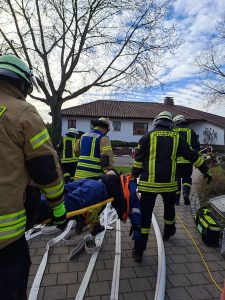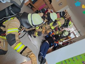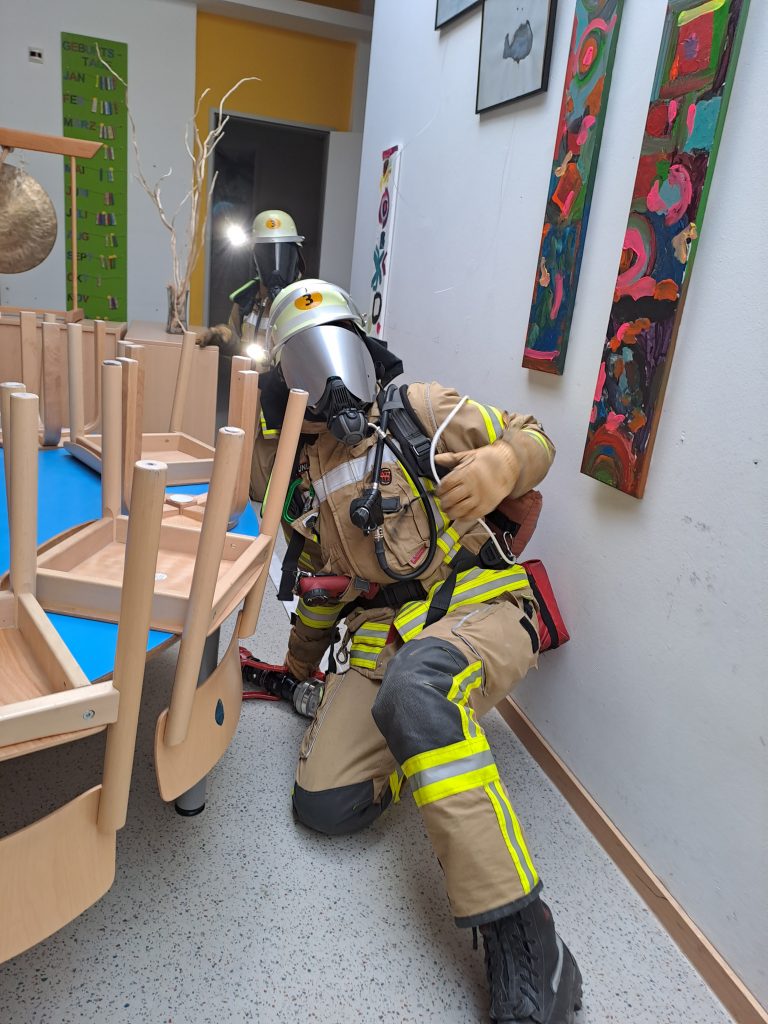 Die ersteintreffenden Kräfte hatten zusätzlich noch die Herausforderung, dass ihnen der Zugang zum Gebäude nicht durch die Erzieherinnen gewährt werden konnte, da die ihre Schlüssel im Gebäude „vergessen“ hatten und die Türen gegen ungewollten Zutritt automatisch verschlossen sind. Nachdem der Feuerwehrplan für das Gebäude gesichtet wurde konnte der „Einsatz“ aber schnell mit dem vorher geübten Vorgehen abgearbeitet, der verletzte Handwerker und die Kinder, die sich in ihren Lieblingsverstecken versteckt hatten, gerettet und das Feuer gelöscht werden. (Verfasser Matthias Bente)