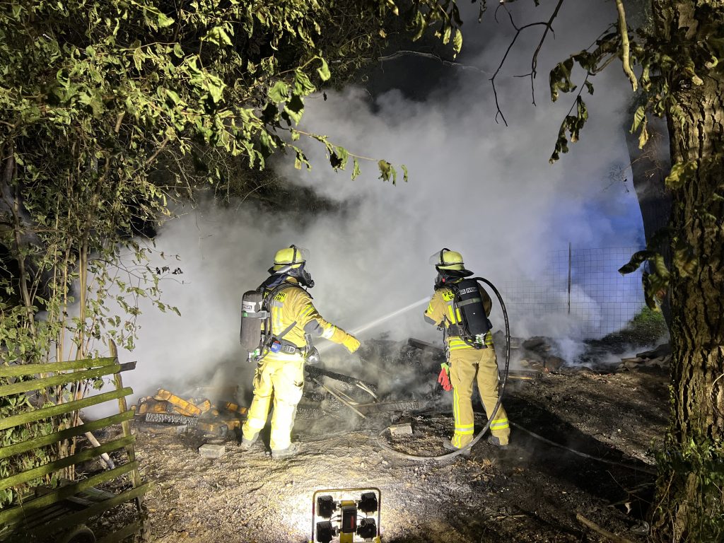 Feuerwehr bekommt Gartenhüttenbrand im Gewann Hammelsbrunnen schnell unter Kontrolle. Das Feuer war aus bisher unbekannter Ursache in der Nacht von Samstag auf Sonntag ausgebrochen.