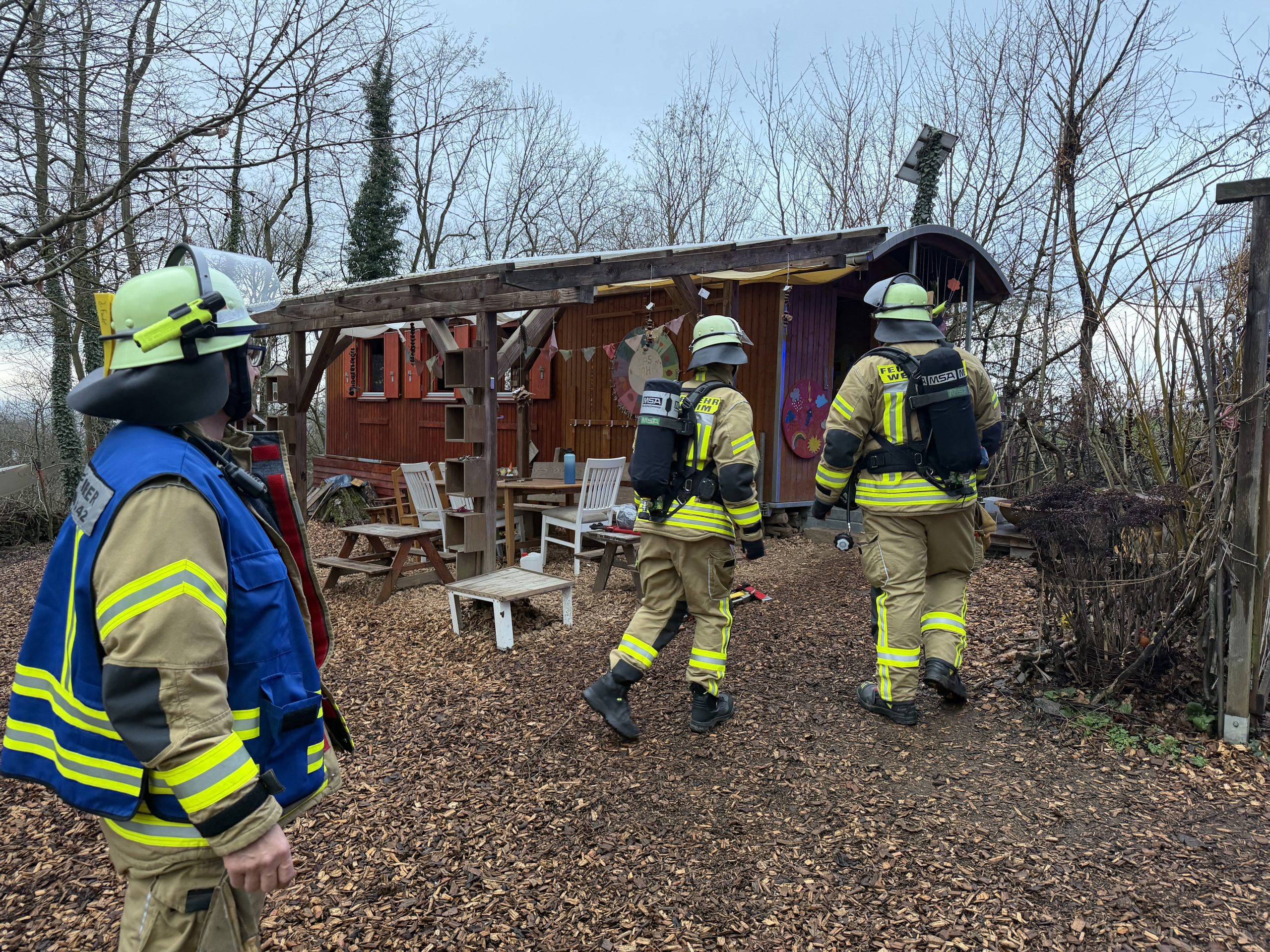 Ein Trupp mit Atemschutz und Messgerät kontrollierte den Bauwagen des Waldkindergarten.