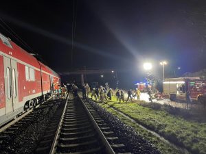 Ein weiterer Einsatz führte die Freiwillige Feuerwehr am Abend auf die Bahnstrecke nach Lützelsachsen. Hier war es zu einem Unfall mit Personenschaden gekommen. Durch den Unfall konnte eine Regionalbahn zunächst nicht mehr weiterfahren. Daher unterstützte die Feuerwehr die Zugreisenden dabei, die Bahn auf der Strecke zu verlassen. Sie konnten dann in einen ICE umsteigen, der die Reisenden dann zum nächsten Bahnhof nach Weinheim brachte.