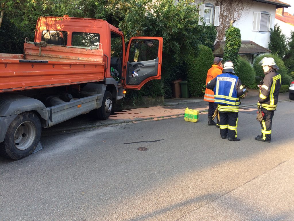 LKW fährt in Vorgarten und verliert große Mengen Betriebsstoffe