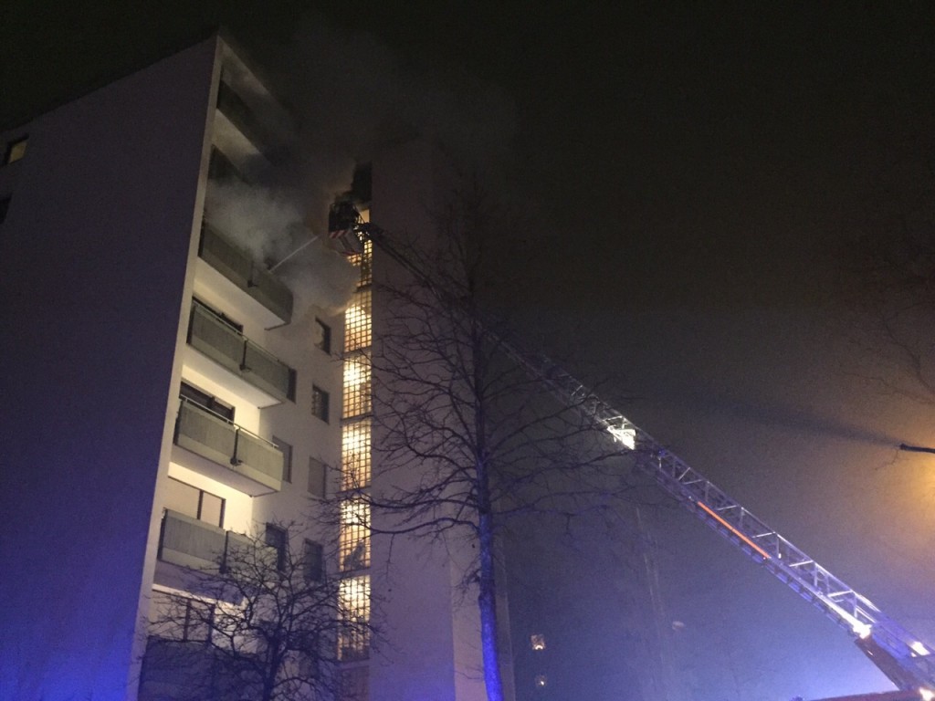 Während die freiwilligen Feuerwehrangehörigen aller Abteilungen, im Stadtgebiet wie auch an allen anderen Tagen des Jahres abrufbereit in Einsatzbereitschaft waren, konnten die meisten den Jahreswechsel ungestört im Kreise ihrer Freunde und Familien feiern. Die Abteilung Stadt hatte eine Silvesterfeier im Feuerwehrzentrum organisiert und stellte eine Wachgruppe. Für die Abteilung Stadt begann das neue Jahr um 0:20 Uhr mit der ersten Alarmierung. Mehrere Notrufe gingen bei der Leitstelle Rhein Neckar ein, dass es in einem Hochhaus im Multring zu einem Zimmerbrand gekommen sei. Der Löschzug (zwei Löschfahrzeuge, Drehleiter und Einsatzleitwagen) rückten gemeinsam mit Polizei und Rettungsdienst zur Einsatzstelle aus. Viele Passanten und Bewohner hatten sich bereits versammelt und wiesen die Feuerwehr ein. Ein Bewohner des Hauses hatte bereits die Wohnungsinhaber informiert, so dass dieses sich auch in Sicherheit bringen konnte. Vor Ort stellte sich heraus, dass es auf dem Balkon zu einem Brand gekommen war, der Blumenkästen und Gegenstände in Mitleidenschaft gezogen hatte. Während ein Trupp unter Atemschutz zur Brandbekämpfung über das Treppenhaus vorging um die Wohnung zu schützen, wurde parallel die Drehleiter mit einem Wenderohr in Stellung gebracht. Nach zehn Minuten war das Feuer gelöscht und ein Übergreifen auf die Wohnung verhindert. Alle Bewohner konnten wieder in ihre Wohnungen und kamen mit einem Schrecken davon. Probleme bereiten der Feuerwehr bei dem Einsatz die Hydranten um die Wasserversorgung sicherzustellen. Während sich ein Hydrant nicht öffnen ließ, musste bei einem anderen mit der Kettensäge eine Hecke entfernt werden um den Hydrantendeckel öffnen zu können und so die Wasserversorgung für die Löschfahrzeuge sicherzustellen.