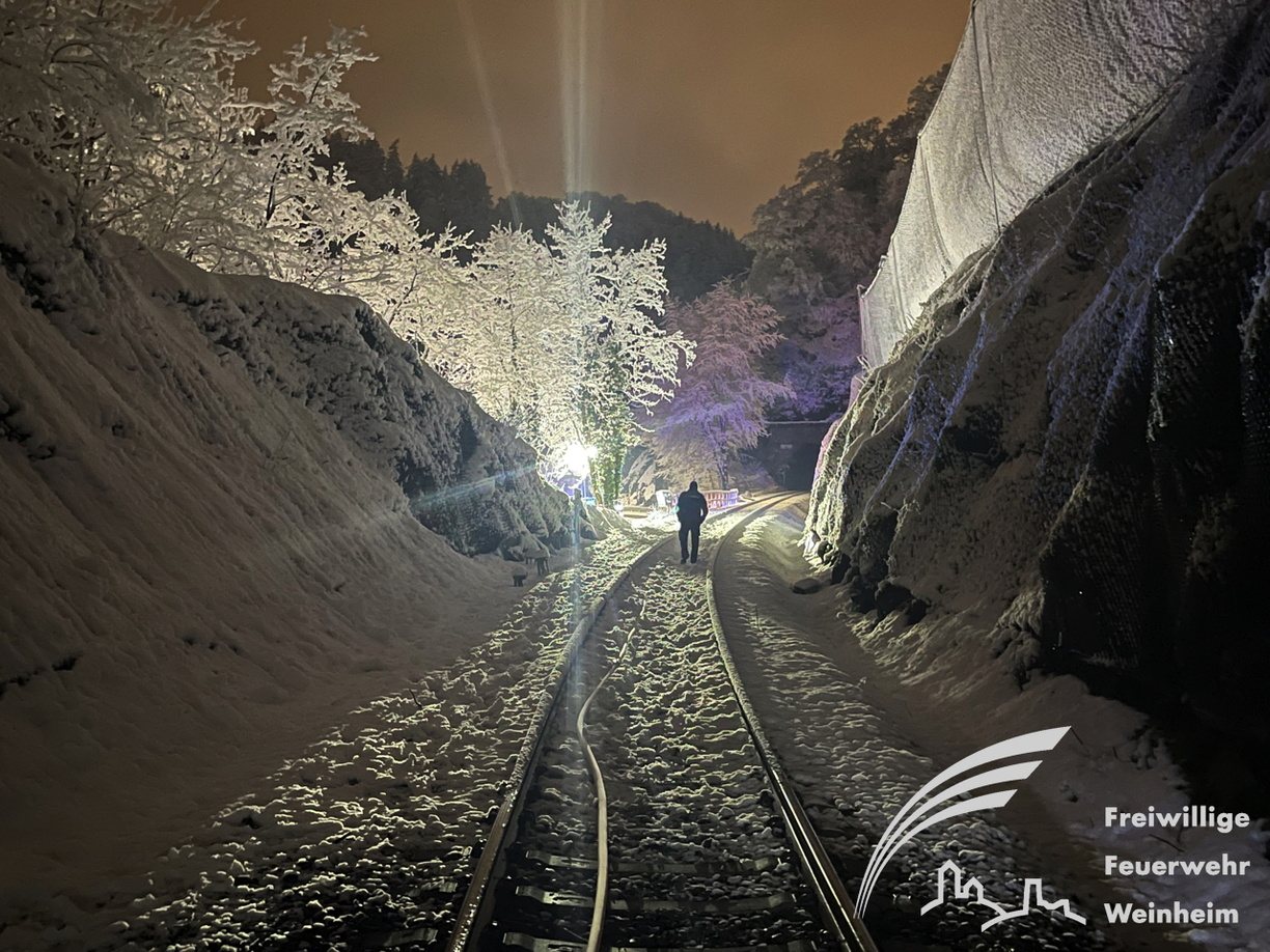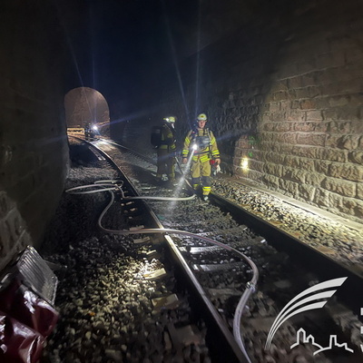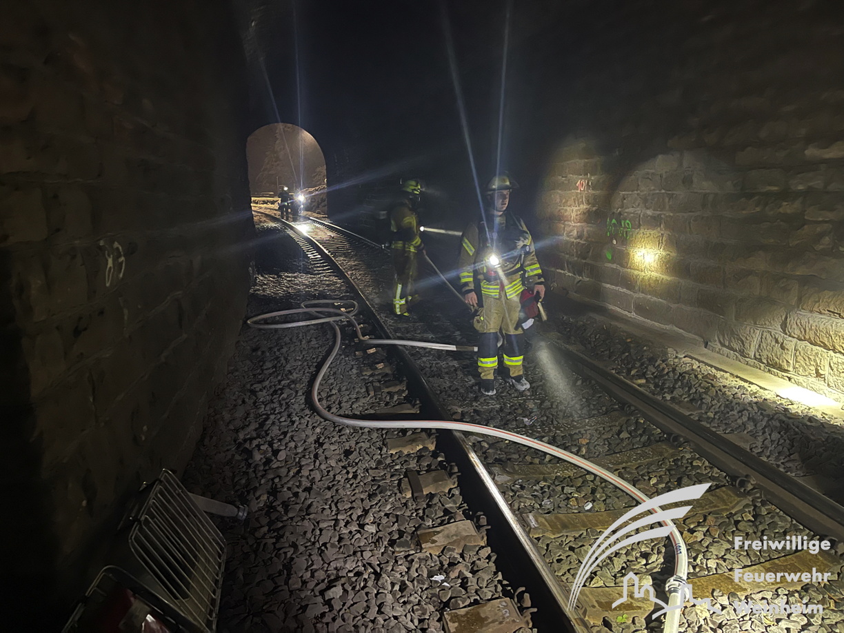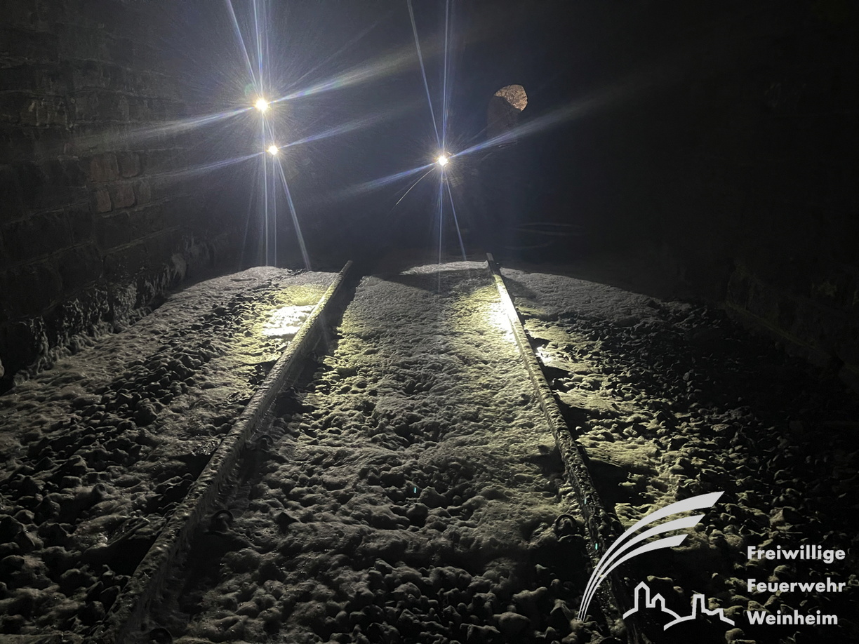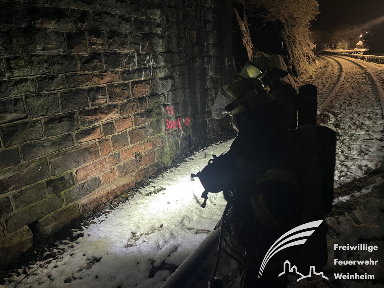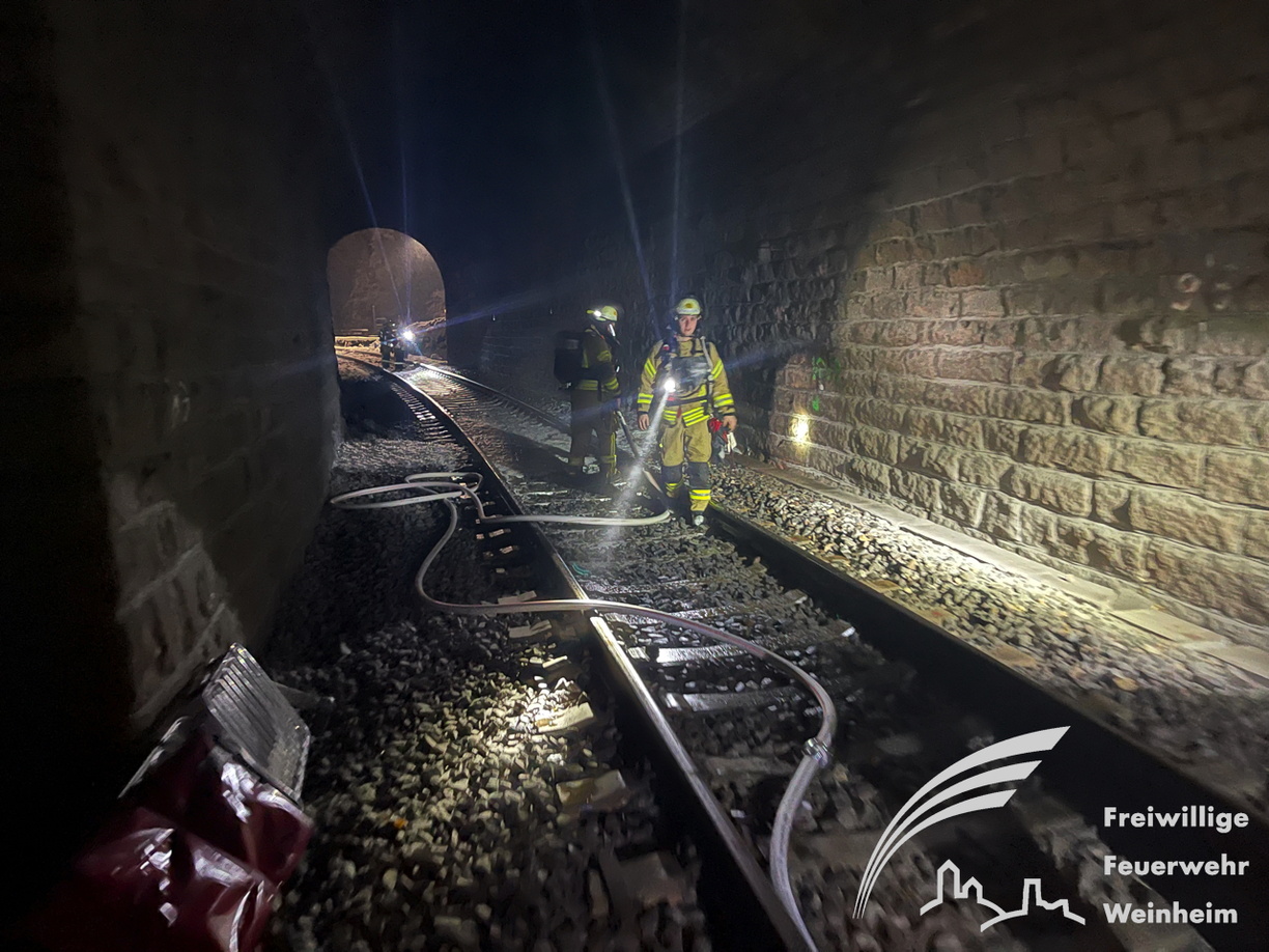 Weinheim. In der Nacht auf Samstag meldete ein Autofahrer, der die Birkenauer Talstraße befuhr, einen Feuerschein aus einem Eisbahntunnel der Bahnstrecke Weinheim-Fürth. Daher rückte die Feuerwehr Weinheim an und konnte in der Tunnelmitte einen Brand lokalisieren. Obwohl die Strecke zu dieser Zeit nicht genutzt wird, bestätigte die Bahn, auch zur Eigensicherung der Einsatzkräfte, die Sperrung der Bahnstrecke. Ein Trupp unter Atemschutz hatte den Kleinbrand in dem 85 m langen Tunnel schnell unter Kontrolle. Während der Löscharbeiten wurde die Birkenauer Talstraße halbseitig gesperrt. Durch den starken Schnellfall wurden die Löscharbeiten der Freiwilligen Feuerwehr Weinheim Abteilung Stadt erschwert. Warum es zu dem Brand gekommen ist, ist unklar. Die Ermittlungen zur Brandursache hat die Bundespolizei übernommen. Sachdienliche Hinweise nimmt die Polizei entgegen. Nachdem der Brand gelöscht war, konnte der Einsatz nach einer Stunde beendet und die Straßensperrung aufgehoben werden.