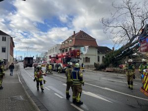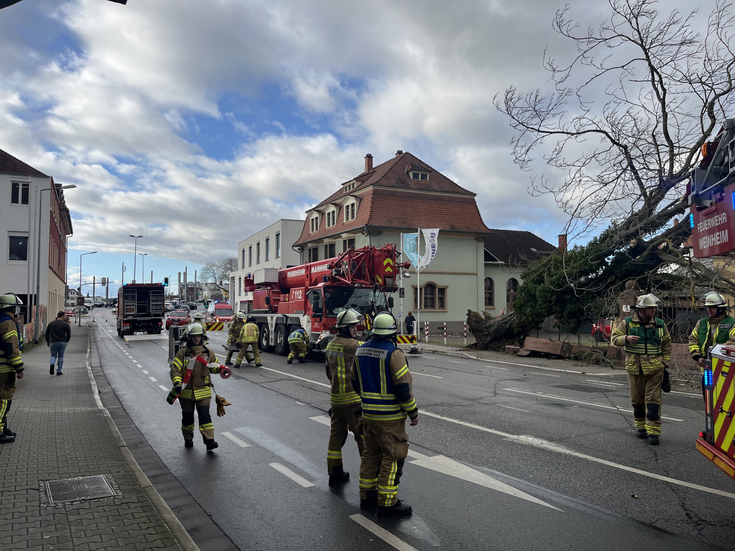 Ein weiterer Einsatz folgte in der Ludwigstraße, wo ein weiterer umgestürzter Baum gemeldet wurde. Hier war die Abteilung Stadt eingesetzt. Beim Eintreffen der ersten Kräfte bestätigte sich das Meldebild. Der Einsatzleiter entschied, zur Unterstützung einen Kran der Berufsfeuerwehr Mannheim an die Einsatzstelle zu alarmieren. Nachdem der Kran eingetroffen war, sicherte er den Baum mit einer Bandschlinge, um ein Verrutschen zu verhindern. Aus dem Korb der Drehleiter heraus wurden die Äste entfernt, was das Gewicht des Baums verringerte. Anschließend konnte der Baum sicher zu Boden gebracht werden. Während der Maßnahmen wurde die Bergstraße voll gesperrt, und der Verkehr durch die anwesende Ordnungspolizei umgeleitet. Glücklicherweise blieb der Einsatz ohne Personenschäden, und der Schaden beschränkte sich auf das Gebäude.