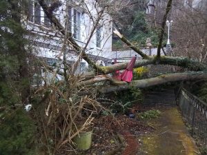 In der Talstraße und der Ludwigstraße fielen durch eine Windböe Bäume um. In der Talstraße konnte die Bewohner dadurch das Haus nicht verlassen und in der Ludwigstraße musste die Berufsfeuerwehr Mannheim mit einem Kran unterstützen.