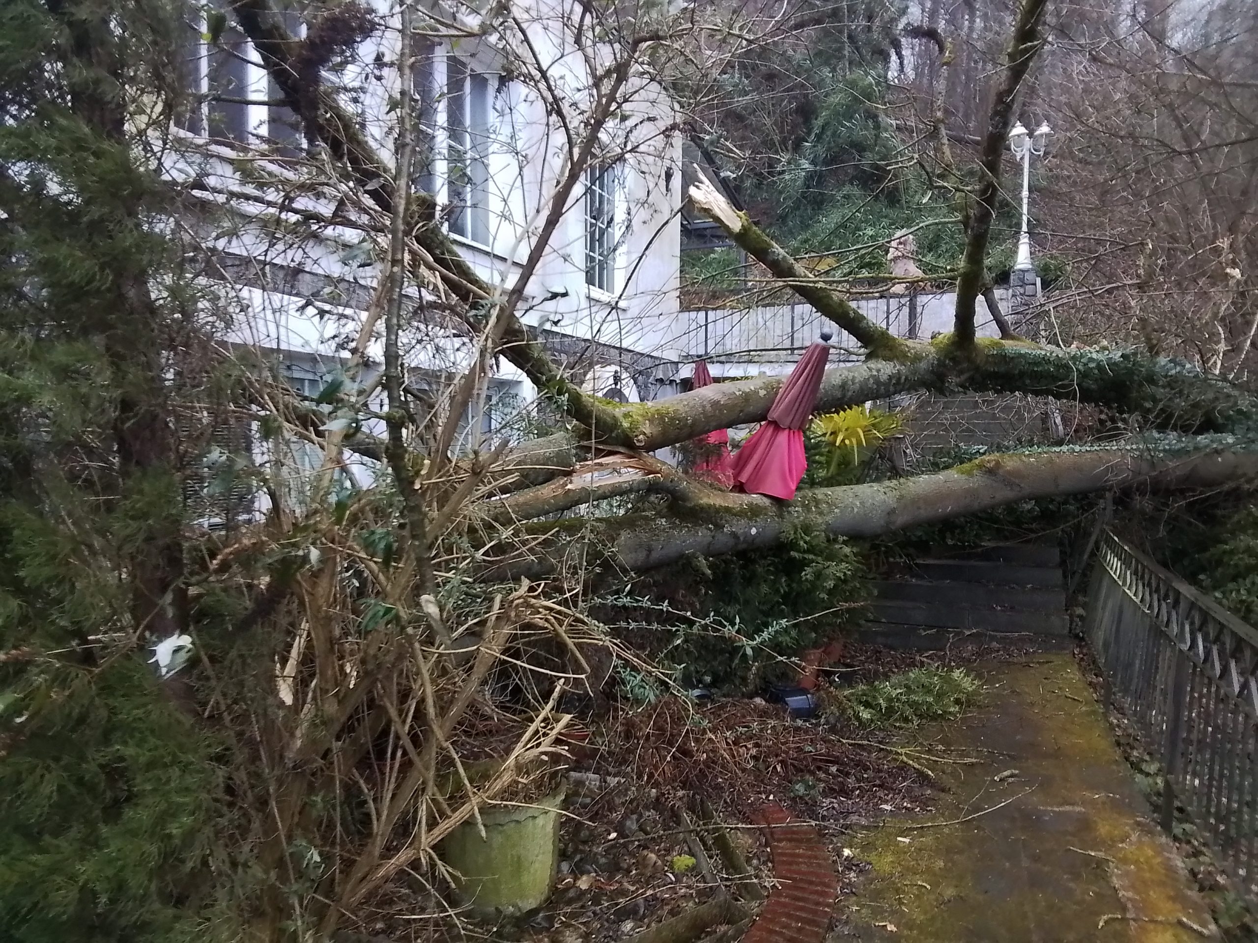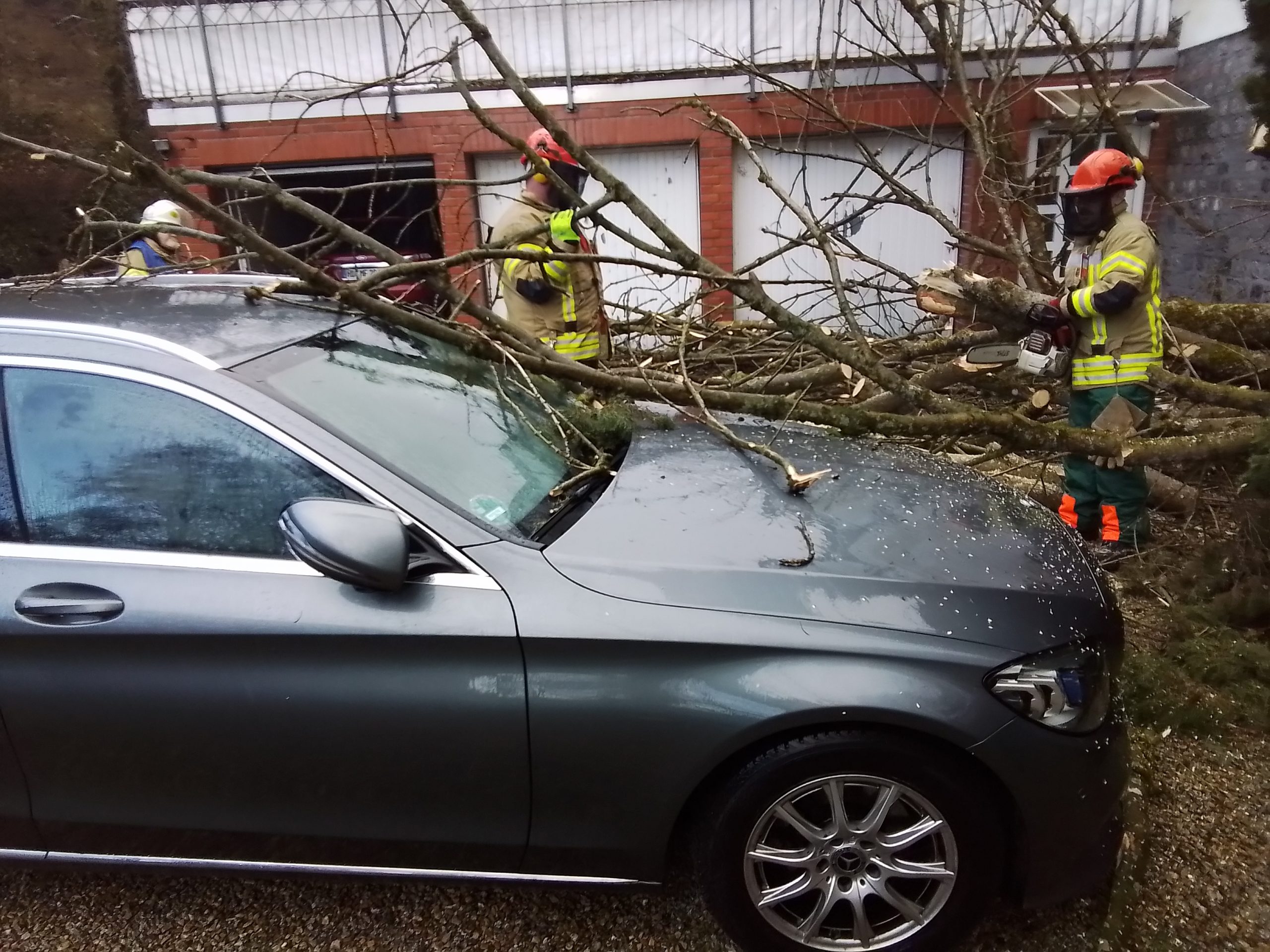 Die Freiwillige Feuerwehr Weinheim Abteilung Lützelsachsen-Hohensachsen rückte schnell an und sicherte die Einsatzstelle. Mithilfe von Kettensägen wurde der Baum beseitigt und der Bewohner befreit. Das beschädigte Auto wurde ebenfalls von den Trümmern befreit. Da eine Fensterscheibe des Hauses beschädigt wurde, kümmerte sich die Feuerwehr um eine notdürftige Verschalung, bis der Eigentümer eine Fachfirma verständigen konnte. Während des Einsatzes war die Talstraße für etwa 1,5 Stunden voll gesperrt.