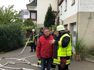 Das Mehrparteienhaus ist aktuell nicht bewohnbar. Um die Brandwohnung vor der androhenden Unwetterlage zu sichern, wurde der Rüstwagen an die Einsatzstelle nachgefordert um die defekten Fenster mit Platten zu verschalen. Erster Bürgermeister Dr. Torsten Fetzner machte sich vor Ort ein Bild der Lage.