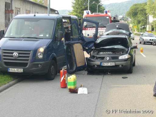 Zu einem Verkehrsunfall auf der B3 in Höhe des Güterbahnhof wurde die Feuerwehr Weinheim Abteilung Stadt am Montagabend gerufen. Aus bisher ungeklärter Ursache kollidierte ein Pkw mit einem Kleintransporter. Während der Fahrer des Kleintransporters unverletzt blieb wurde die Fahrerin des Pkw sowie ...