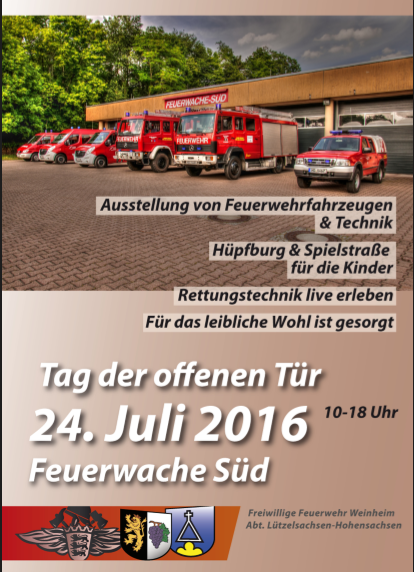 Am Sonntag den 24.07.2016 öffnete die Freiwillige Feuerwehr Weinheim Abteilung Lützelsachsen-Hohensachsen ihre Pforten für die Bevölkerung. Trotz des regnerischen Wetters fanden wieder Zahlreich Besucher den Weg zur „Feuerwache Süd“. Wie jedes Jahr haben sich die Kameraden der Abteilung für ihre Gäste etwas einfallen ...