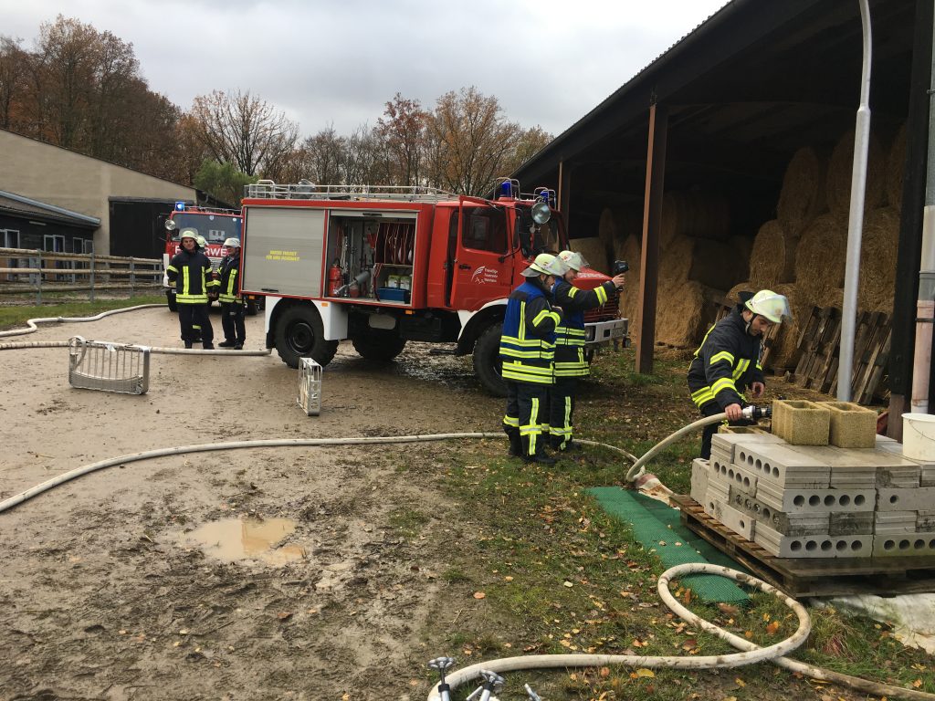 Durch beherztes Eingreifen von Anwohnern ging am Sonntagmittag ein Brand auf einem Reiterhof in der Götzstraße im Weinheimer Ortsteil Oberflockenbach glimpflich aus. In einer Hütte neben einem Strohballenlager brach aus bisher ungeklärter Ursache ein Feuer aus. Die starke Rauchentwicklung machte ein Löschen für die Ersthelfer unmöglich, so dass sie über die Notrufnummer 112 die Feuerwehr alarmierten. Die Leitstelle Rhein Neckar alarmierte darauf die Abteilung Oberflockenbach gemeinsam mit den Abteilungen Rippenweier, Ritschweier und Stadt. Während dem die Feuerwehr zur Einsatzstelle ausrückte, versuchten Anwohner mit einem Radlader die Strohballen aus der angrenzenden Halle zu entfernen, um eine Ausbreitung des Feuers zu verhindern. Nachdem die Feuerwehr eingetroffen war, gingen die Einsatzkräfte mit einem Rohr unter Atemschutz in den Brandraum vor und löschten das Feuer. Mit einem zweiten Rohr wurde eine Riegelstellung zwischen Strohballenlager und Hütte aufgebaut um ein Übergreifen auf die Halle zu verhindern. Die Abteilungen stellten die Wasserversorgung sicher und unterstützten die örtliche Einsatzleitung. Mit einem Lüfter wurde der Rauch aus dem Gebäude gedrückt und eine abschließende Brandnachschau mit der Wärmebildkamera durchgeführt. Verletzt wurde niemand. Die Einsatzstelle wurde zur Brandursachenermittlung der Polizei Weinheim übergeben.
