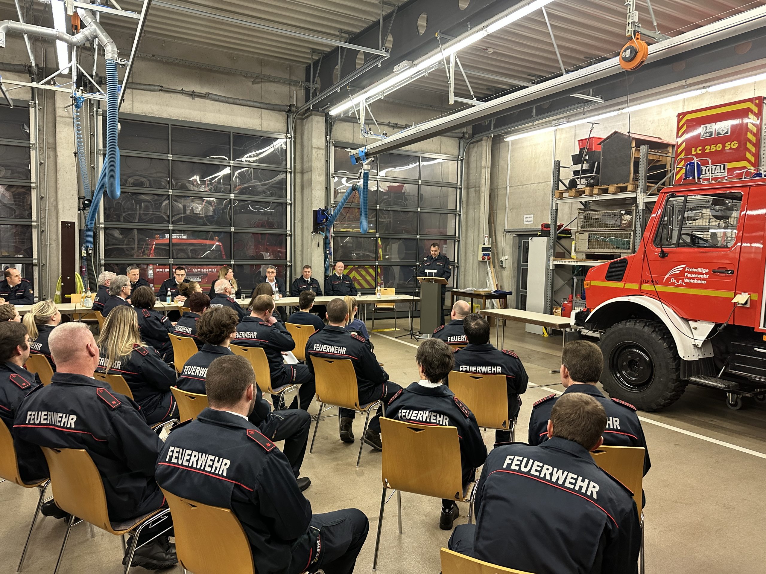 Weinheim. Zwischen Tanklöschfahrzeug und Einsatzmaterial fand die diesjährige Jahreshauptversammlung der Abteilung Oberflockenbach statt. 39 aktive Einsatzkräfte davon 10 Frauen zählt Weinheims-Feuerwehrabteilung zurzeit und die Tendenz ist steigend. Das Durchschnittsalter der aktiven Wehr beträgt 43 Jahre. Das freute an dem Abend nicht nur Abteilungskommandant Sven Hufnagel mit seinen Stellvertretern Andreas Auer und Mike Junghans, sondern auch Feuerwehrkommandant Bernd Meyer und seine Stellvertreter Volker Jäger und Matthias Bente. Da die Abteilung aber inzwischen so groß ist, konnte die Versammlung nicht im Lehrsaal abgehalten werden, da dieser mit den Mitgliedern der Alters- und Ehrenabteilung und Gästen für die Jahreshauptversammlung zu klein gewesen wäre. Die Platzprobleme sind kein neues Thema in Oberflockenbach, denn bereits im letzten Jahr machte die Abteilung darauf aufmerksam. Für die aktiven Frauen konnte inzwischen auch eine Lösung gefunden werden, wie Abteilungskommandant Sven Hufnagel berichtet. Diese hatten zu wenig Platz im Umkleidebereich. Hier dankte Hufnagel besonders Feuerwehrdezernent Dr. Torsten Fetzner, der sich um die schnelle Umsetzung kümmerte und mit dem Hochbauamt durch einen Umbau einen größeren Umkleidebereich realisierte.