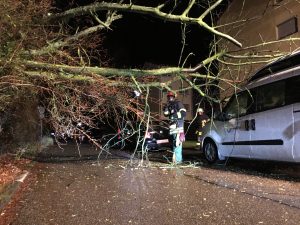 Auch im Schlehdornweg mussten die ehrenamtlichen Einsatzkräfte in der Nacht tätig werden. Ein umgestürzter Baum sorgte für einen weiteren Einsatz. Der Rüstwagen rückte gemeinsam mit dem Gerätewagen Licht zur Einsatzstelle aus. Während sich die Besatzung des Rüstwagen um den Baum im Schlehdornweg kümmerte, sicherte die Besatzung des GW-Licht die Einsatzstelle auf der Mannheimer Straße ab. Dies war erforderlich, da der Baum auf dem Grünstreifen zwischen Schlehdornweg und Mannheimer Straße stand. Mit der Kettensäge wurde der Baum zerkleinert und am Straßenrand gelagert. Nach einer halben Stunde waren die beiden betroffenen Straßen wieder frei.