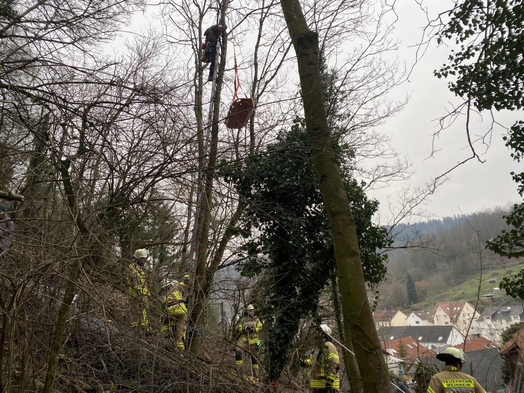 Nicht weniger aufwendig war die Rettung von Kater „Alex“ am Samstagnachmittag. Wie sich vor Ort herausstellte, verfolgte bereits am Donnerstag ein Hund den Kater im Bereich der Betentalstraße, so dass dieser auf einen Baum in circa 11 Meter Höhe flüchtete. Von dort kam er selbstständig allerdings nicht mehr herunter. Daher rückte die Feuerwehr in das sehr steile und unwegsame Gelände an. Die ersten Maßnahmen mit der Feuerwehrsteckleiter brachten nicht den gewünschten Erfolg. Daher wurde mit einer Schleifkorbtrage versucht dem Kater eine Plattform zu bieten, damit er darauf klettern kann. Aber auch dieser Versuch scheiterte. Zur Unterstützung wurden neben der Berufstierrettung Rhein-Neckar auch ein Baumkletterer nachgefordert. Gemeinsam konnte man dann den Kater unterstützen, den Weg nach unten zu finden. Nach gut zwei Stunden war der Einsatz beendet.