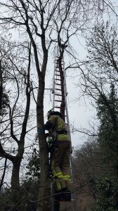 Nicht weniger aufwendig war die Rettung von Kater „Alex“ am Samstagnachmittag. Wie sich vor Ort herausstellte, verfolgte bereits am Donnerstag ein Hund den Kater im Bereich der Betentalstraße, so dass dieser auf einen Baum in circa 11 Meter Höhe flüchtete. Von dort kam er selbstständig allerdings nicht mehr herunter. Daher rückte die Feuerwehr in das sehr steile und unwegsame Gelände an. Die ersten Maßnahmen mit der Feuerwehrsteckleiter brachten nicht den gewünschten Erfolg. Daher wurde mit einer Schleifkorbtrage versucht dem Kater eine Plattform zu bieten, damit er darauf klettern kann. Aber auch dieser Versuch scheiterte. Zur Unterstützung wurden neben der Berufstierrettung Rhein-Neckar auch ein Baumkletterer nachgefordert. Gemeinsam konnte man dann den Kater unterstützen, den Weg nach unten zu finden. Nach gut zwei Stunden war der Einsatz beendet.