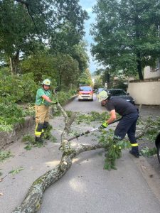 Auch die Abteilung Stadt musste am Samstagabend ausrücken. In der Babostraße war ein Ast heruntergefallen und blockierte die Straße. Mit einer Handsäge hatten die Feuerwehrleute den großen Ast schnell zerkleinert und lagerten ihn am Straßenrand. Im Anschluss konnte die Einsatzstelle dem städtischen Baubetriebshof übergeben werden.