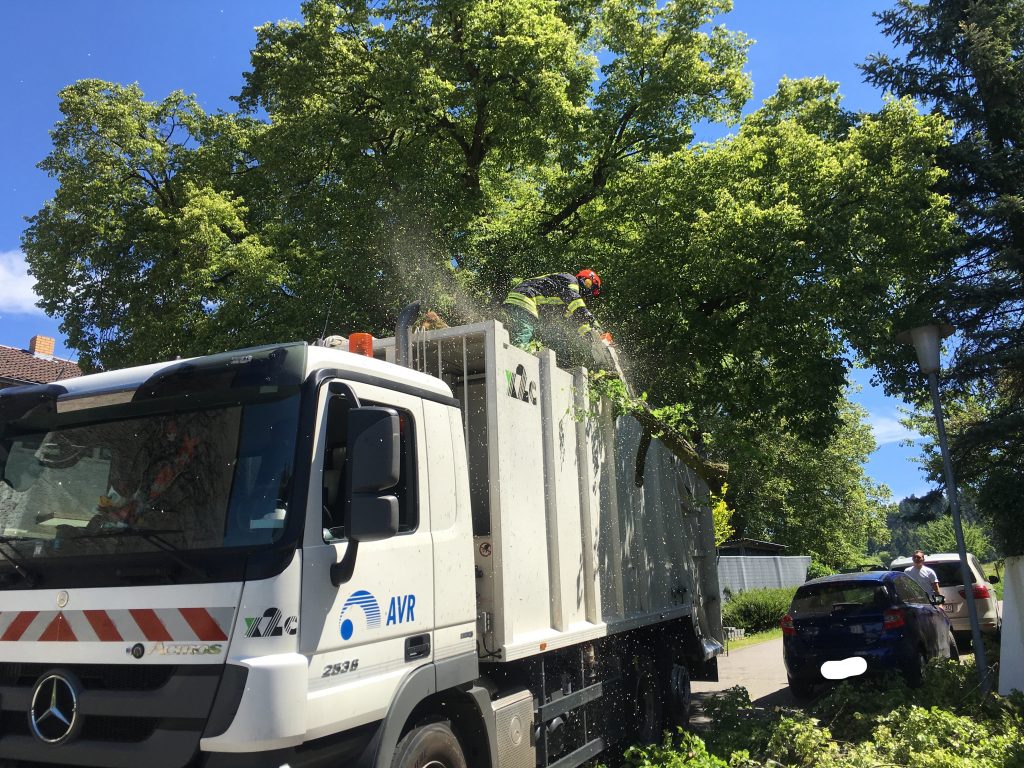 Die Abteilung Rippenweier musste um kurz nach 12 Uhr Am Brunnacker technische Hilfe leisten. Aufgrund eng geparkter Fahrzeuge war ein Müllfahrzeug ausgewichen und musste durch eine tiefhängende Baumkrone durchfahren. Dabei riss der Aufbau einen dicken und schweren Ast aus der Baumkrone, der auf dem Müllfahrzeug liegen blieb und von dort drohte herab zustürzen. Die Einsatzkräfte zersägten mit einer Kettensäge schnell den großen Ast und beseitigten die Gefahrenstelle. Die Reste der Baumkrone wurden am Straßenrand gelagert und die Einsatzstelle der Polizei übergeben.