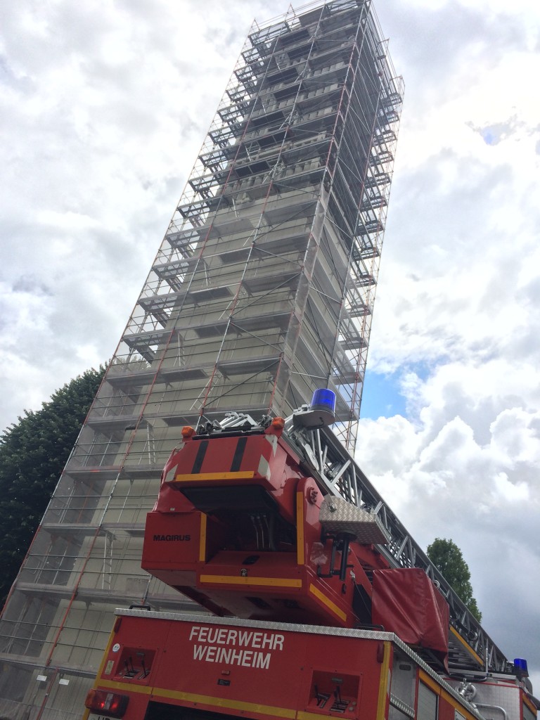 Zu einer Tierrettung musste die ehrenamtlichen Kräfte der Abteilung Stadt am Samstagnachmittag in den Birkenweg ausrücken. Ein Turmfalke war in einem Baugerüst eines Kirchturms gefangen und fand den Ausgang nicht mehr. Nachdem Anwohner nicht mehr weiter wussten riefen sie die Feuerwehr um den Falken aus seiner misslichen Lage, in der er sich seit längerer Zeit befand zu retten. Zur Unterstützung wurde der Vogelexperte Dietmar Matt hinzugezogen. Während überlegt wurde wie man den Vogel ohne größeren Schaden befreien konnte, kam ein weiterer Turmfalke dazu und setzte sich auf das Gerüst. Er nahm Kontakt mit seinem Artgenossen auf und nach mehreren Versuchen, schaffte es der Turmfalke Leiter für Leiter, Stockwerk für Stockwerk selbstständig nach oben zu klettern und sich zu befreien. Die Drehleiter der Feuerwehr musste nicht mehr in den Einsatz kommen und das Netz musste nicht aufgeschnitten werden.