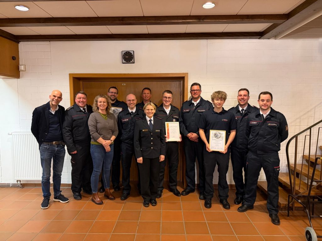 Im Rahmen der Ehrungen und Beförderungen wurde Lennert Jörder für 10 Jahre Mitgliedschaft geehrt. Für 20 Jahre Mitgliedschaft erhielten Marcel Barimani und Sebastian Schmitt eine Ehrung. Für 30 Jahre wurde Simon Schmitt und für 40 Jahre aktiven Dienst Frank Littmann ausgezeichnet.