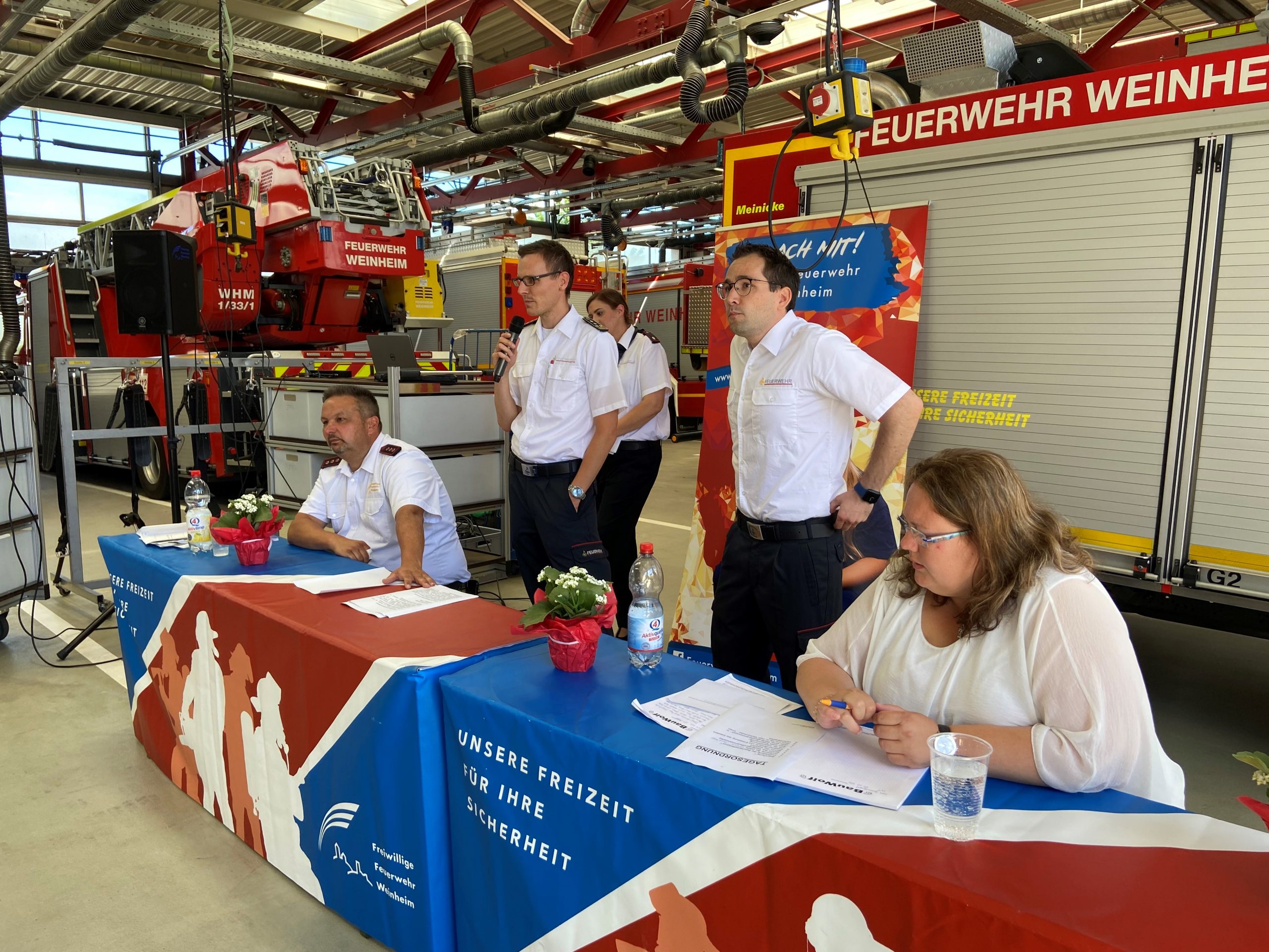 Weinheim. Inmitten der Fahrzeughalle des Weinheimer Feuerwehrzentrums fand die Jahreshauptversammlung aller Weinheimer Jugendfeuerwehrabteilungen statt. Stadtjugendfeuerwehrwart Daniel Paradiso ging in seiner Begrüßung auf die Corona-Lage ein, die seit März 2020 gerade bei der Jugendfeuerwehr zu einem langen Stillstand führte. Daher freute er sich mit den Anwesenden umso mehr, dass man sich wieder in Präsenz treffen kann und inzwischen der Betrieb einigermaßen wie vor 2020 laufen kann. 118 Mädchen und Jungen im Alter von 6 bis 17 Jahren sind Mitglied der Weinheimer Jugendfeuerwehr. Sie alle waren aufgerufen, eine neue Führungsspitze zu wählen, nachdem Daniel Paradiso und sein Stellvertreter Markus Schäfer ihre Ämter zur Verfügung gestellt hatte. Feuerwehrkommandant Bernd Meyer, Kreisjugendfeuerwehrwartin Eva Nicolai und Bereichsjugendfeuerwehrwart Dominik Ewald bedankten sich in ihren Grußworten für die Arbeit der bisherigen Jugendführung und würdigten Daniel Paradiso und Markus Schäfers Engagement für die Jugendarbeit, aber auch für die Zukunftssicherung der Einsatzabteilungen.