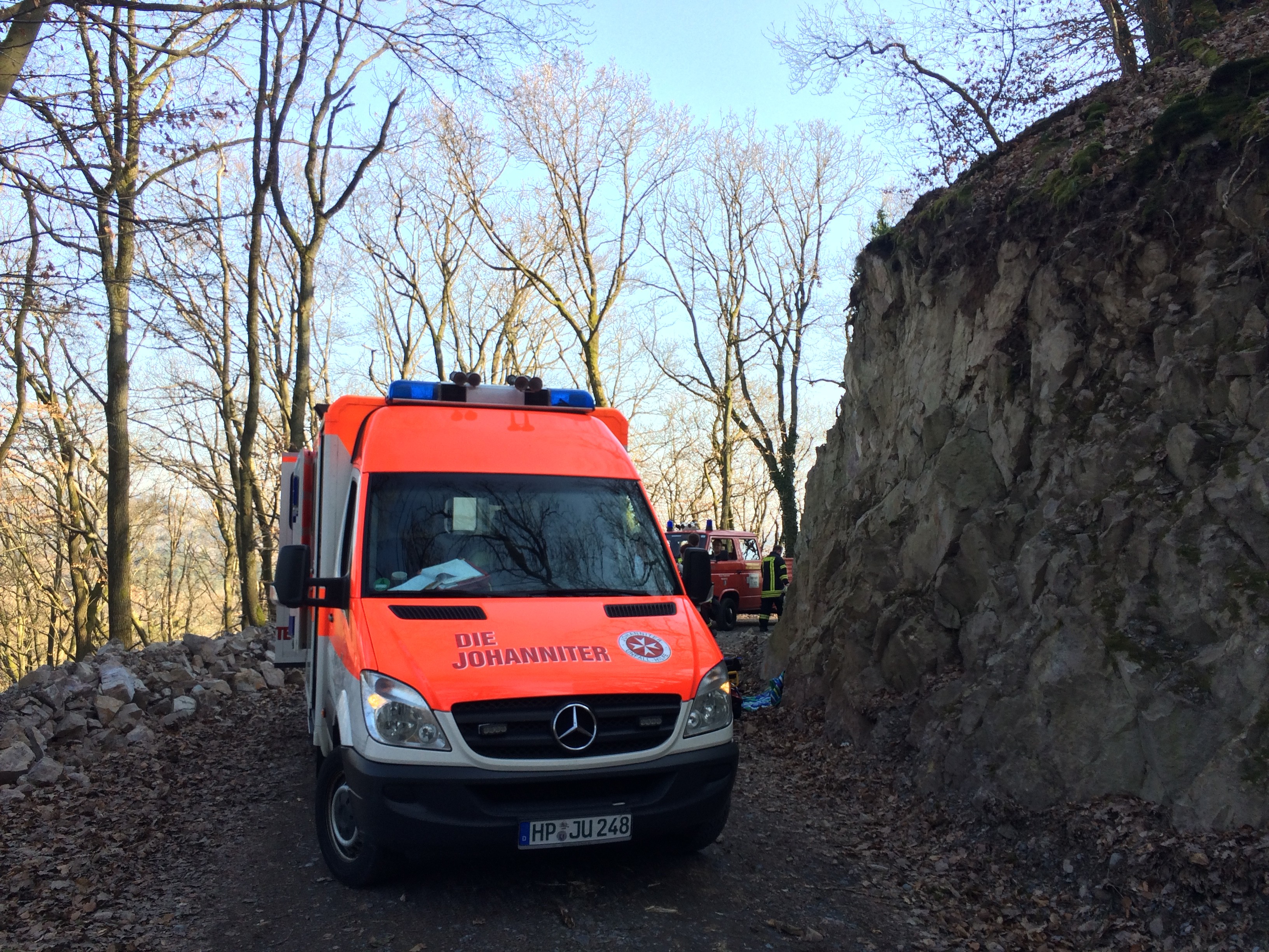 Um kurz vor 15 Uhr wurde die Abteilung Stadt dann erneut alarmiert. Diesmal ging es auf den Weinheimer Wachenberg. Circa 500 Meter nach dem Waldparkplatz an der Wachenburg war eine Person von einem Felsen aus circa 8 Meter Höhe auf einen Waldweg gestürzt. Da zunächst davon ausgegangen wurde, dass die Person aus unwegsamen Gelände gerettet werden muss, wurde die Feuerwehr zur Unterstützung alarmiert. Da die Person aber auf dem Waldweg lag, konnte sie nach der Erstversorgung durch den Rettungsdienst in ein Mannheimer Krankenhaus zur weiteren Behandlung gebracht werden. Die Feuerwehr räumte Felsbrocken zur Seite, damit der Rettungswagen freie Fahrt zum Wendepunkt hatte.