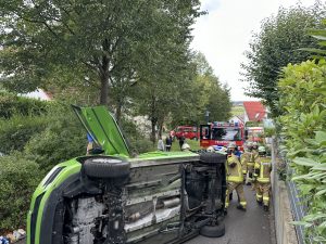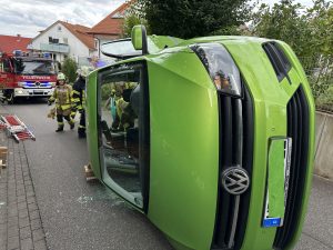 Am Samstagnachmittag kam es in der Straße Zum Lindenbrunnen kurz nach 15 Uhr zu einem Verkehrsunfall mit einem Fahrzeug. Wie es zu dem Unfall kam, ist Gegenstand der Ermittlungen, die das Polizeirevier Weinheim aufgenommen hat. Die Feuerwehr Weinheim Abteilung Lützelsachsen-Hohensachsen wurde alarmiert, da eine Person im Fahrzeug eingeschlossen war. Vor Ort hatte sich bereits ein Ersthelfer Zugang ins Fahrzeug verschafft und betreute die leichtverletzte Fahrerin mit dem inzwischen eingetroffen Rettungsdienst. Die Feuerwehr sicherte das Fahrzeug gegen Kippen und weiteres wegrutschen in der steilen Straße. Über das Heck des Fahrzeugs wurde ein Zugang ermöglicht, so dass sich die Fahrerin und der Ersthelfer mit Unterstützung von Feuerwehr und Rettungsdienst selbstständig befreien konnten. Parallel zu den Rettungsarbeiten wurde der Brandschutz sichergestellt und die Unfallstelle abgesperrt. Die Fahrerin wurde zur weiteren Untersuchung durch den Rettungsdienst in ein Krankenhaus gebracht.
