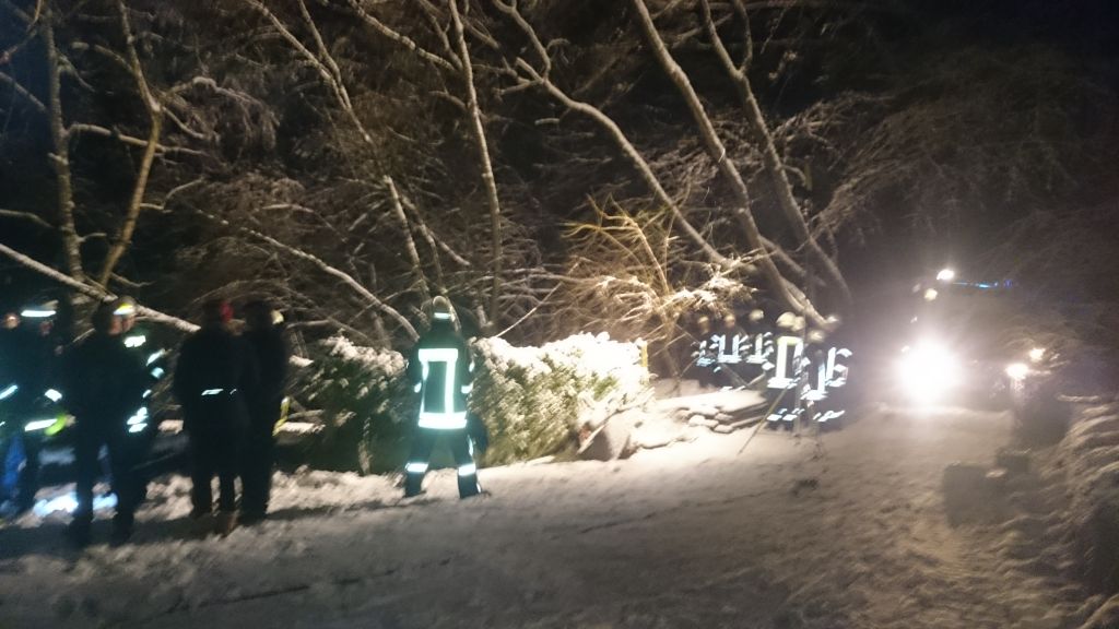 Da das Haus im Wald steht und nur über einen unbefestigten Waldweg zu erreichen ist, hatten die Einsatzkräfte zunächst das Problem vor Ort zu kommen. Nur Allradfahrzeuge mit Schneeketten konnten direkt zu der Unglücksstelle anfahren, das restliche Material musste zu Fuß von den 20 Einsatzkräften hin transportiert werden. Nach Rücksprache mit den Stadtwerken Weinheim wurde Beleuchtung aufgebaut, der Baum und der Freileitungsmast am Haus gesichert. Um weiteres technisches Gerät vor Ort zu bekommen, wurde der Rüstwagen der Abteilung Weinheim Stadt angefordert. Nachdem die Freileitung stromlos war, konnte diese mit Kettensägen soweit frei geschnitten werden, damit die Leitung ohne Gefahr wieder zugeschaltet werden konnte. Die Stadtwerke kümmern sich im Laufe der Woche um eine Reparatur der Freileitung. Auch die Abteilung Rippenweier musste an diesem Abend schon ausrücken und einen umgestürzten Baum auf der L596 entfernen.